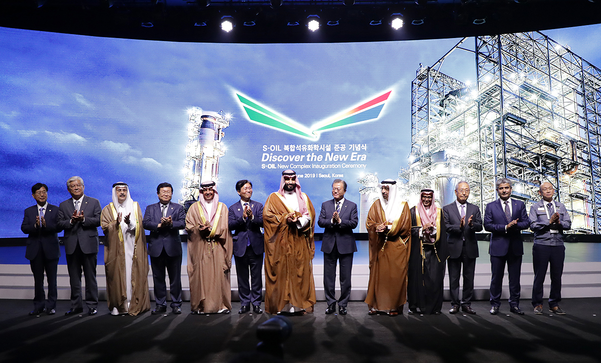 문재인 대통령과 무함마드 빈 살만 사우디아라비아 왕세자 겸 부총리가 26일 신라호텔에서 열린 에쓰오일(S-OIL) 복합 석유화학시설 준공기념식에서 참석자들과 기념촬영을 하고 있다.