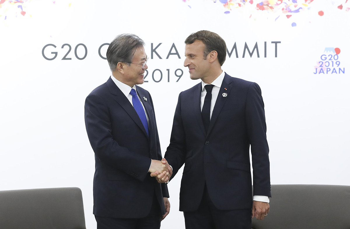 문재인 대통령과 에마뉘엘 마크롱 프랑스 대통령이 28일 오후 G20 정상회담장인 인텍스 오사카 양자회담장에서 한-프랑스 정상회담을 하고 있다.