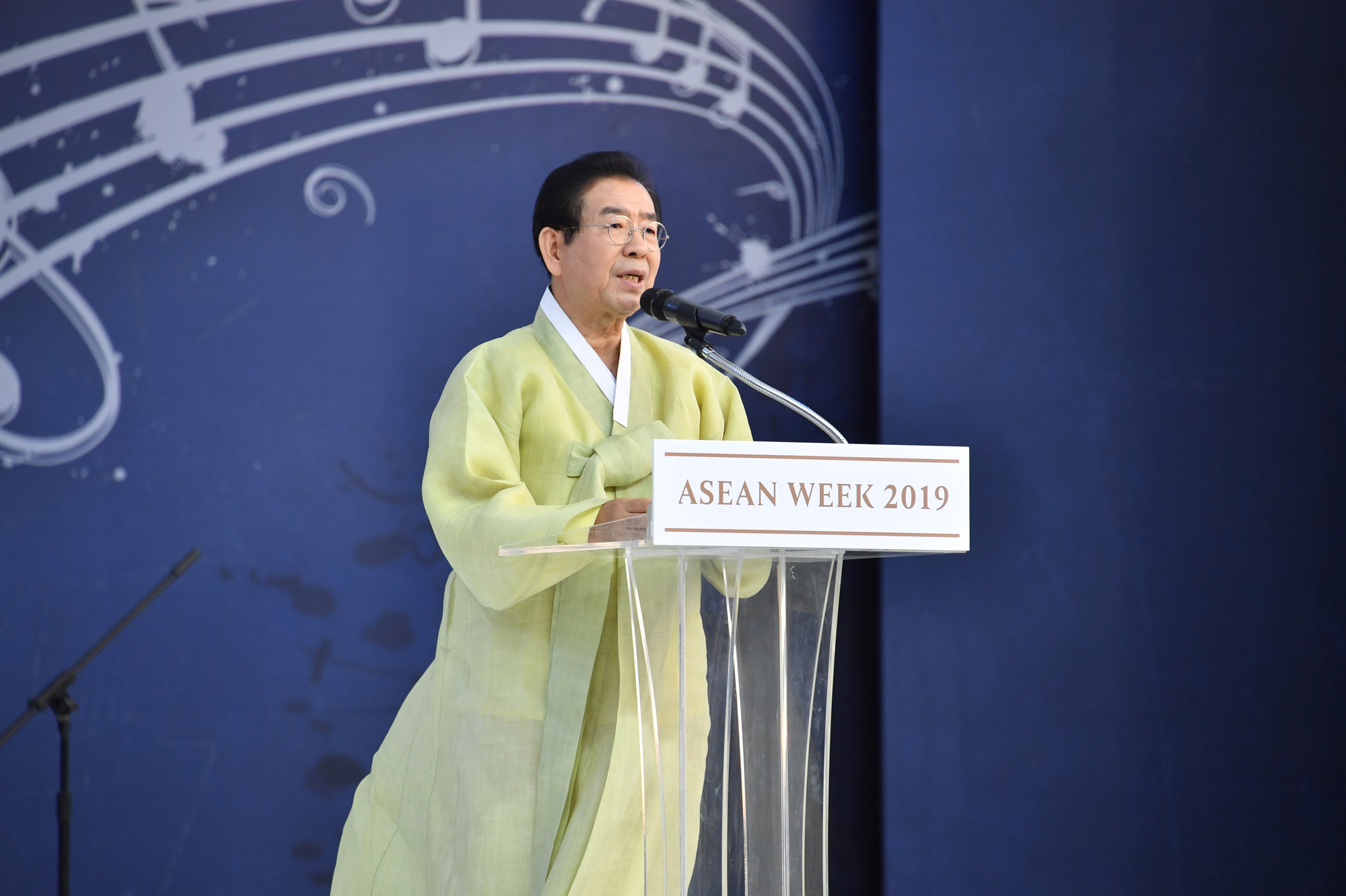 박원순 서울시장이 14일 오후 서울 중구 서울광장에서 열린 ‘2019 아세안 위크’ 개막식 행사에서 환영사를 하고 있다. 서울시 제공