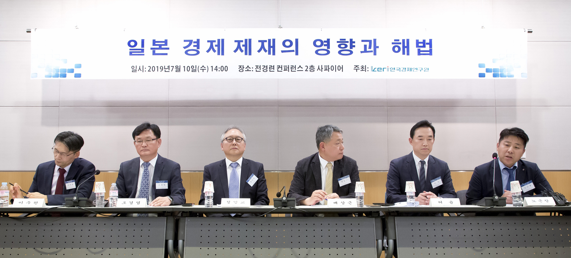 | 사진설명 | [eoimage=서울] 임준선 기자 = 10일 오후 서울 여의도 전경련회관 컨퍼런스센터에서 '일본 경제 제재의 영향과 해법'을 주제로 열린 한국경제연구원 긴급세미나에서 발제자 등이 종합토론을 하고 있다. 오른쪽부터 노근창 현대차증권 리서치센터장, 허윤 서강대 국제대학원 교수, 배상근 한국경제연구원 전무, 정인교 인하대 국제통상학과 교수, 조경엽 한국경제연구원 선임연구위원, 이주완 하나금융경영연구소 연구위원. 2019.07.10 eomaster@eoimage.com |