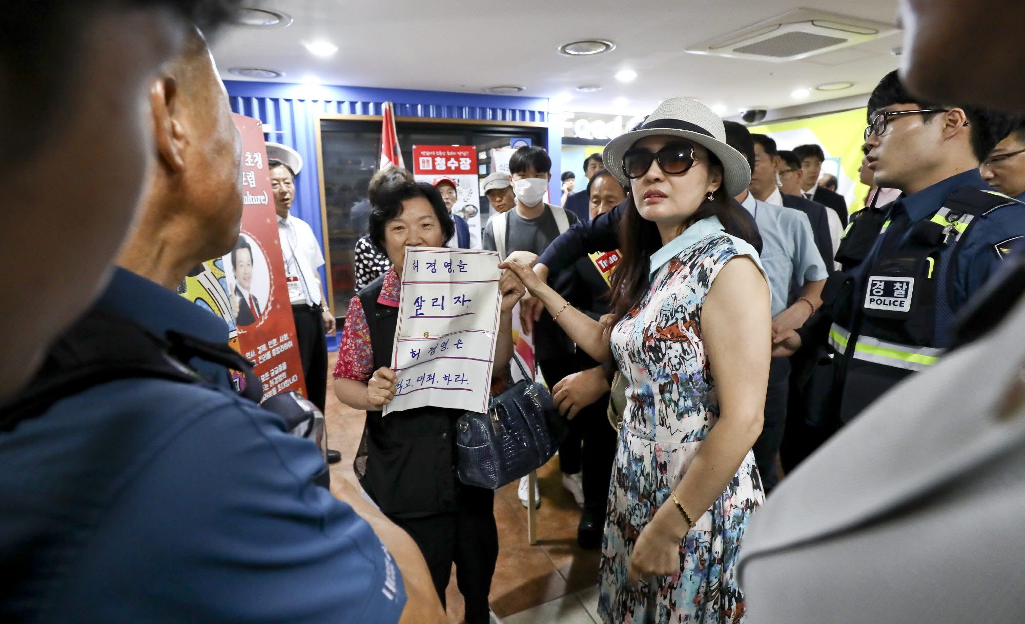 [서울=eoimage] 고성준 기자 = 허경영과 열애설이 있었던 가수 최사랑이 13일 서울 종로구 허경영 강연장 앞에서 경찰과 이야기 하고있다. 2019.7.13