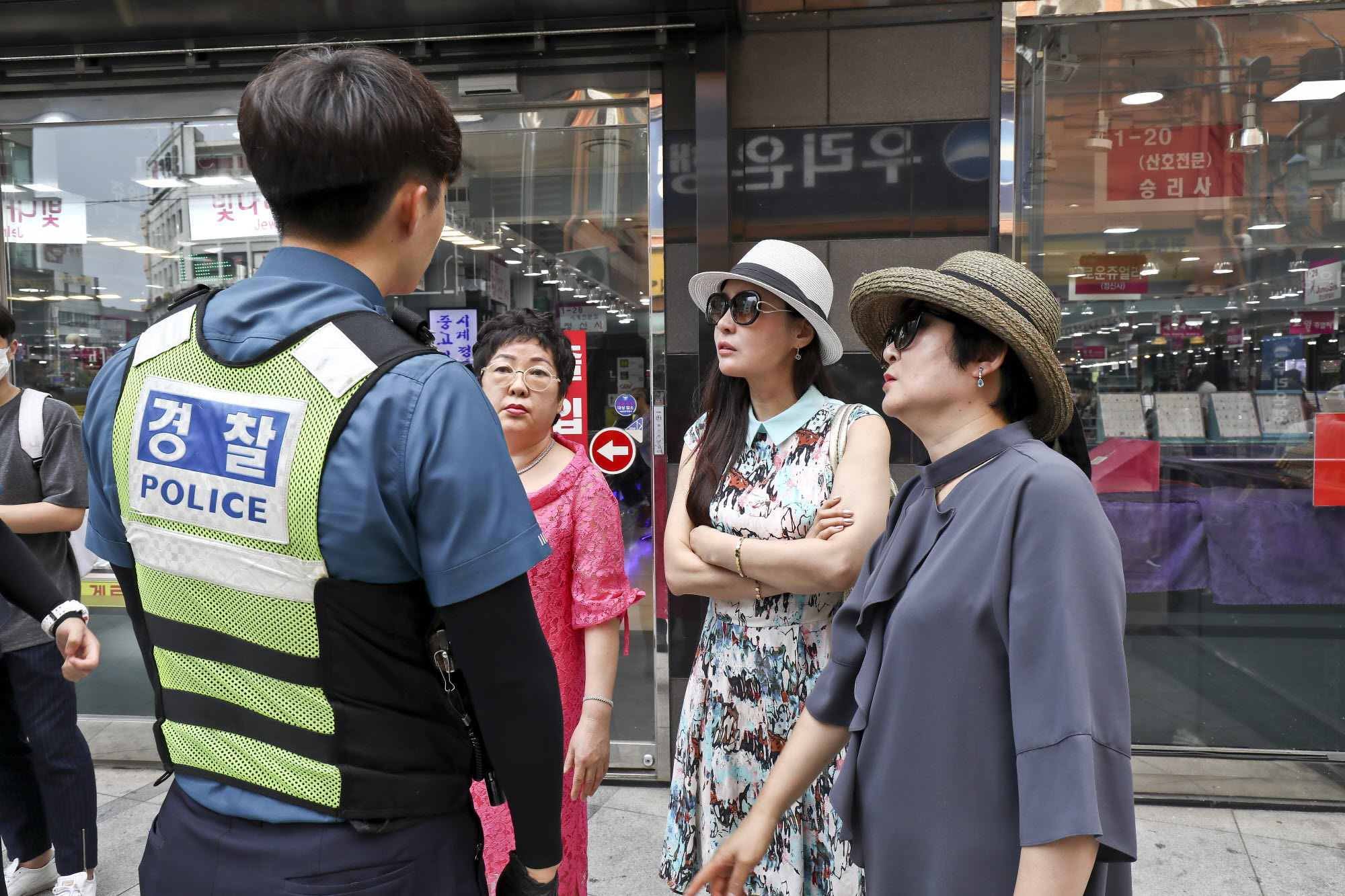[서울=eoimage] 고성준 기자 = 허경영과 열애설이 있었던 가수 최사랑이 13일 서울 종로구 허경영 강연장 앞에서 경찰과 이야기 하고있다. 2019.7.13