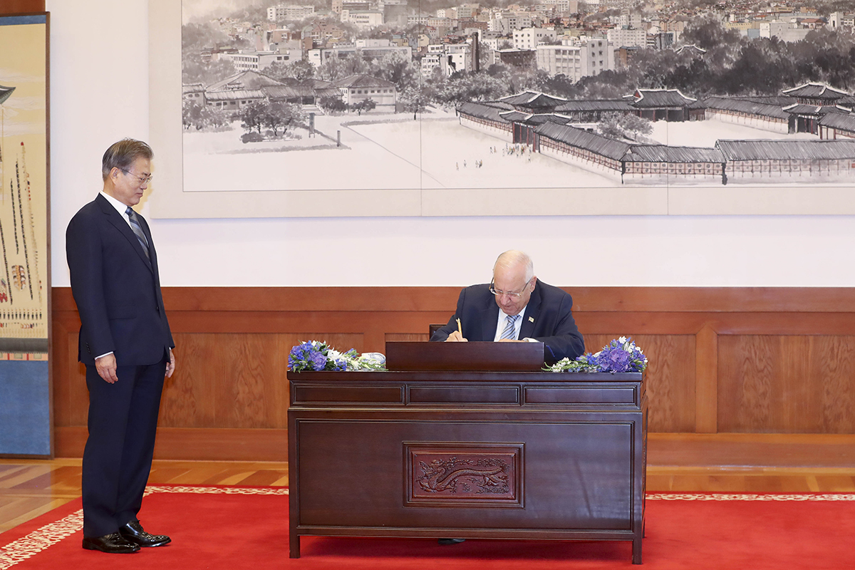 문재인 대통령이 15일 청와대 본관에서 레우벤 리블린 이스라엘 대통령의 방명록 작성을 바라보고 있다.
