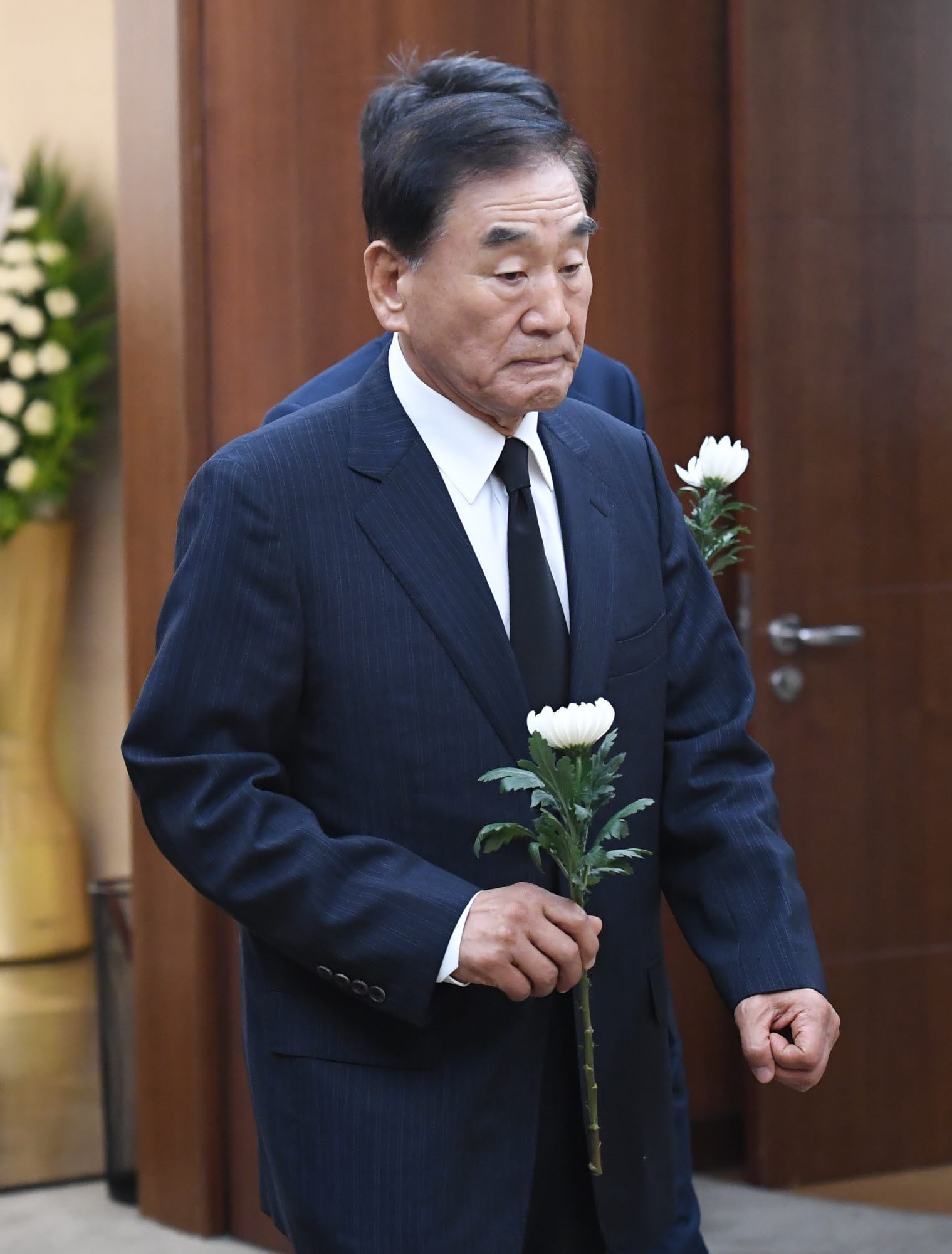 이재오 전 의원이 17일 오전 서울 마포구 연세대학교 세브란스병원 장례식장 마련된 정두언 전 새누리당 의원(현 자유한국당) 빈소를 찾아 조문하고 있다. 2019.7.17