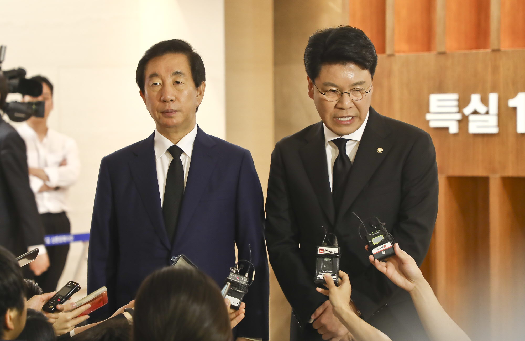 17일 서울 신촌 세브란스병원 장례식장에 마련된 고 정두언 전 의원 빈소를 찾은 자유한국당 김성태, 장제원 의원이 조문을 마친 뒤 취재진 질문에 답변하고 있다. 2019.7.17