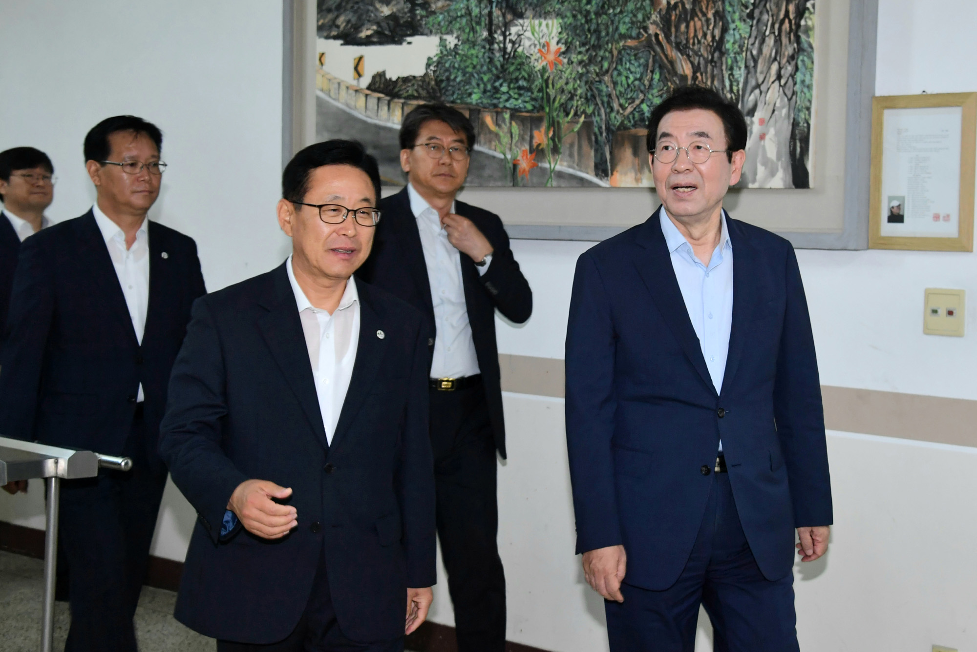 이차영 괴산군수와 박원순 서울시장은 5일 괴산군청에서 양 지역 상생발전을 위한 우호 교류 협약을 맺고 6개 분야 협력 사업을 추진하기로 했다. 서울시 제공