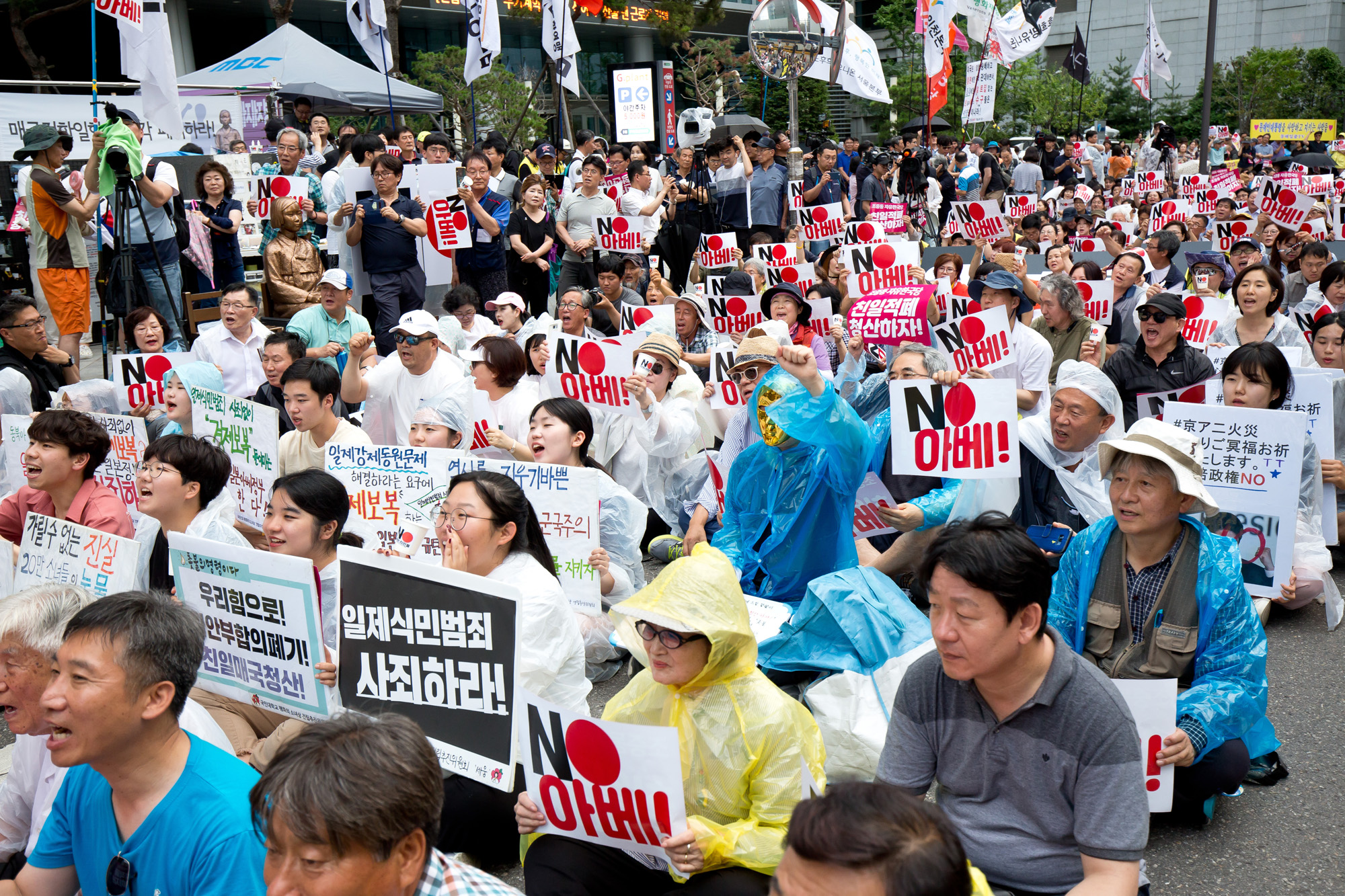 [eoimage=서울] 임준선 기자 =20일 오후 서울 종로구 옛 일본대사관 앞에서 일본의 경제보복과 아베 신조 일본 총리를 규탄하는 촛불집회가 열리고 있다. 2019.07.20