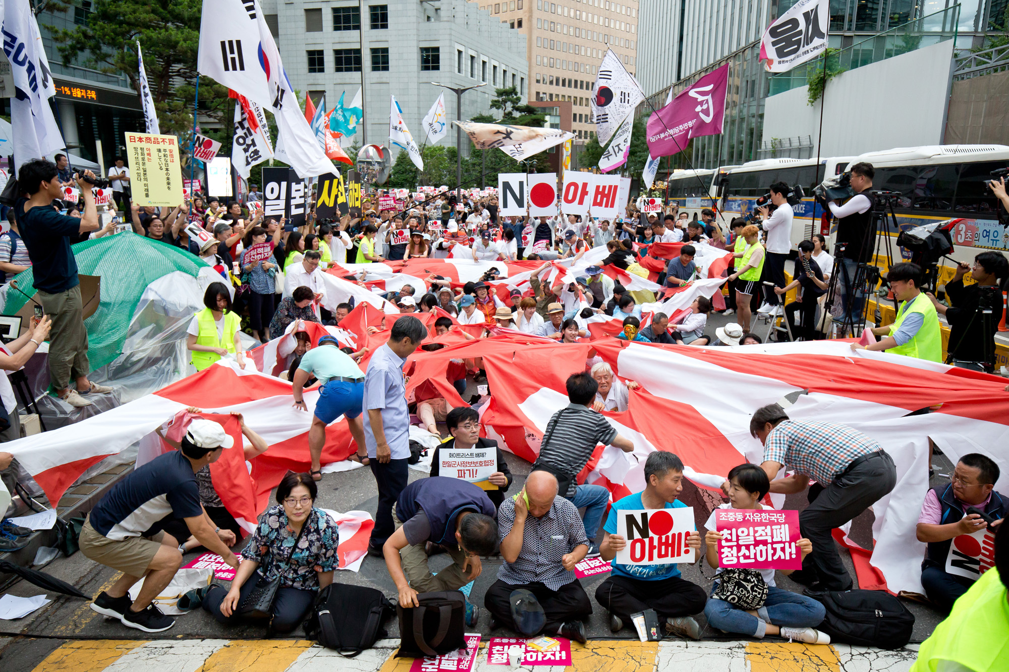 [eoimage=서울] 임준선 기자 =20일 오후 서울 종로구 옛 일본대사관 앞에서 열린 일본의 경제보복과 아베 신조 일본 총리를 규탄하는 촛불집회가 끝난 뒤 참석자들이 대형 욱일기를 찢는 퍼포먼스를 하고 있다. 2019.07.20