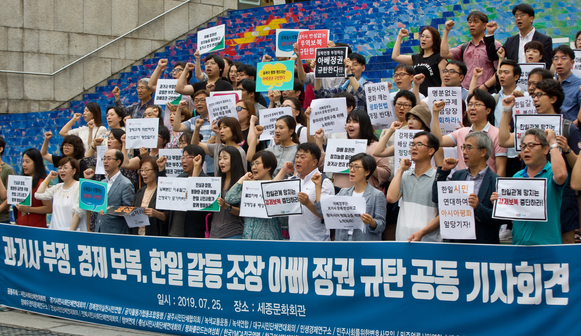 [서울=eoimage] 고성준 기자 = 참여연대와 경제정의실천시민연합(경실련) 등으로 구성된 시민사회단체연대회의가 25일 오전 서울 종로구 세종문화회관 계단 앞에서 '과거사 부정, 경제보복, 한일 갈등 조장 아베 정권 규탄 공동기자회견'을 열고 있다. 2019.7.25