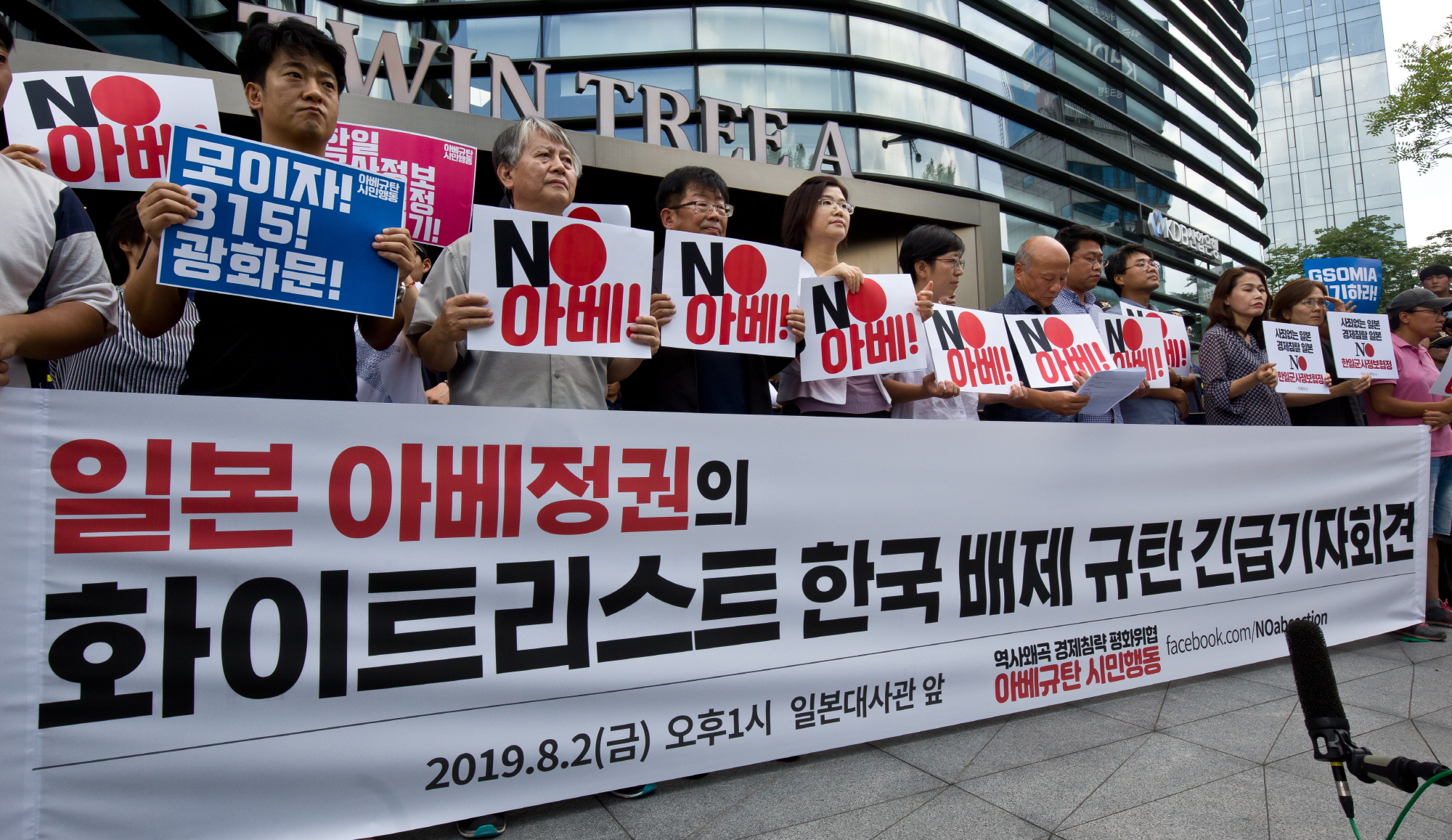 [서울=eoimage] 고성준 기자 = 2일 오후 서울 종로구 일본대사관 앞에서 아베규탄시민행동 회원들이 일본 아베정권의 화이트리스트 한국 배제 규탄 긴급기자회견을 열고 있다. 2019.8.2