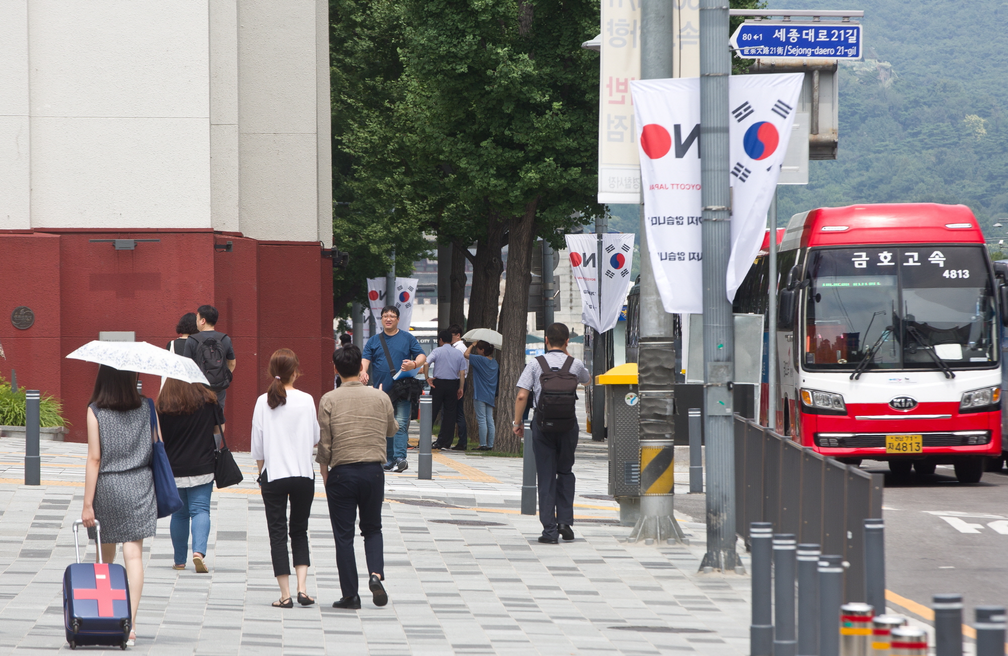 [서울=eoimage] 고성준 기자 = 6일 오후 서울 중구 서울시청 일대에 일본 불매 관련 깃발이 걸려있다. 2019.8.6