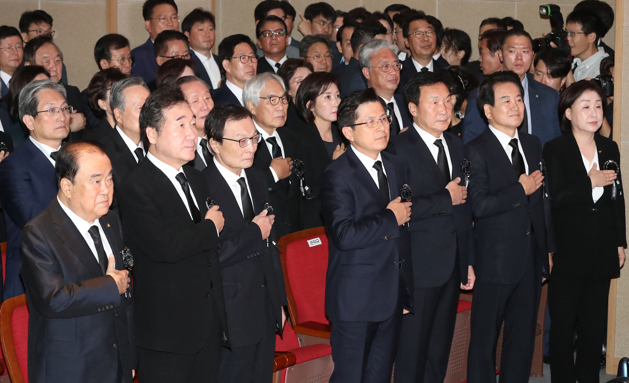 | 사진설명 | 18일 서울 동작구 국립서울현충원에서 고 김대중 전 대통령 서거 10주기 추도식이 열렸다. 이날 추도식에는 문희상 국회의장, 이낙연 국무총리, 이해찬 더불어민주당 대표, 황교안 자유한국당 대표, 손학규 바른미래당 대표, 정동영 민주평화당 대표, 심상정 정의당 대표 등이 참석했다. 참석자들이 국민의례를 하고있다. 2019.08.18 사진/임준선기자 (현장풀) |