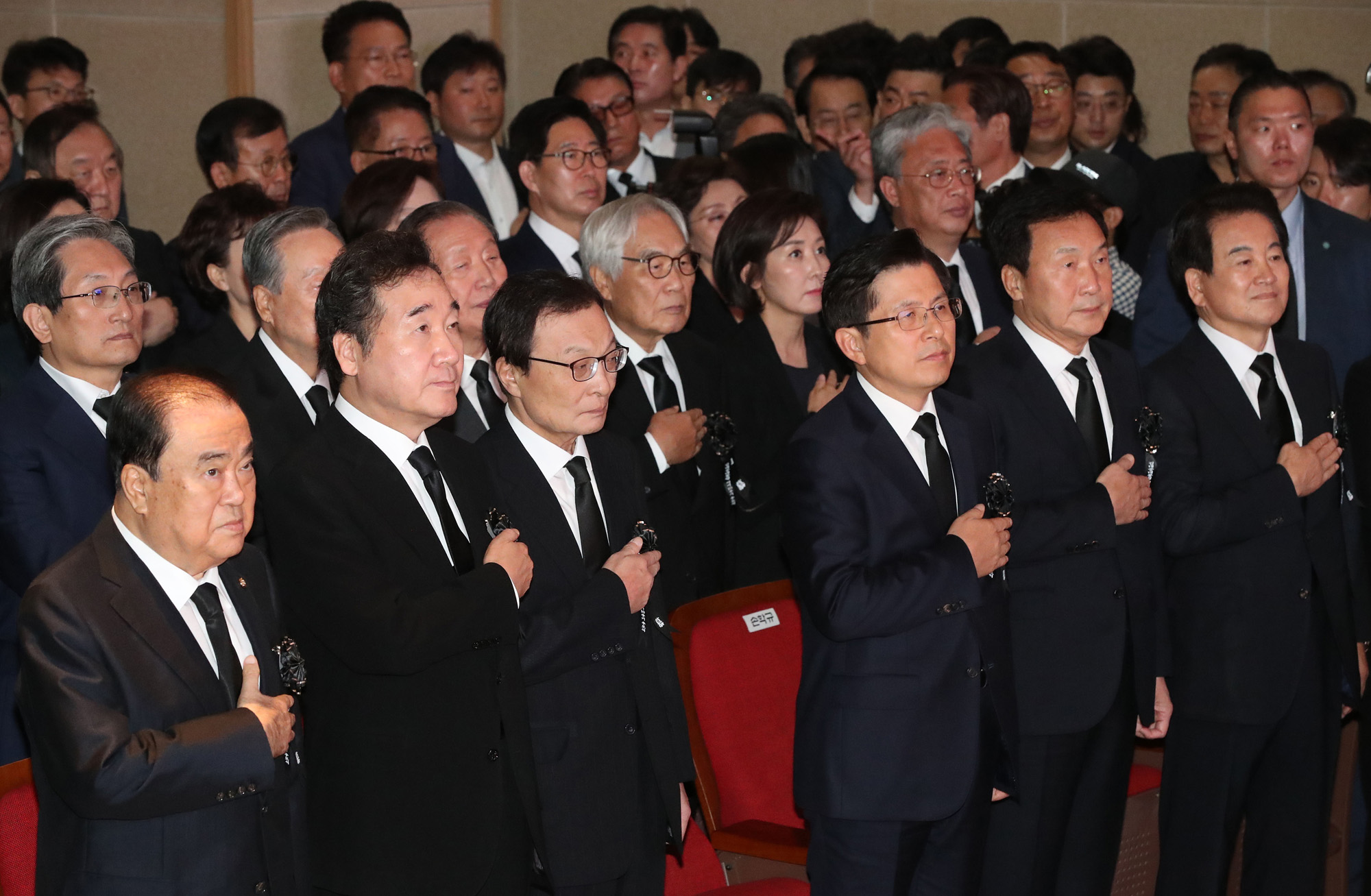 | 사진설명 | 18일 서울 동작구 국립서울현충원에서 고 김대중 전 대통령 서거 10주기 추도식이 열렸다. 이날 추도식에는 문희상 국회의장, 이낙연 국무총리, 이해찬 더불어민주당 대표, 황교안 자유한국당 대표, 손학규 바른미래당 대표, 정동영 민주평화당 대표, 심상정 정의당 대표 등이 참석했다. 참석자들이 국민의례를 하고있다. 2019.08.18 사진/임준선기자 (현장풀) |