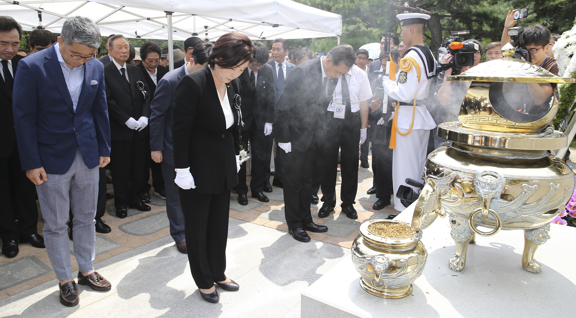 심상정 정의당 대표를 비롯한 당원들이 18일 오전 서울 동작구 국립서울현충원에서 열린 고(故) 김대중 전 대통령 서거 10주기 추도식에서 묵념을 하고 있다. 2019.08.18 사진/임준선기자 (현장풀)
