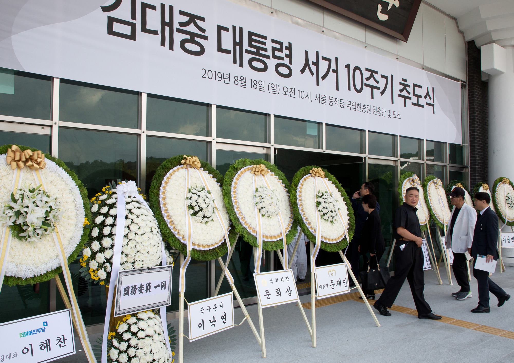 [Eoimage=서울] 임준선 기자 =8일 오전 국립서울현충원에서 열린 김대중 전 대통령 서거 10주기 추도식에 문재인 대통령의 화환이 진열되어 있다. 2019.08.18 eomaster@eoimage.com