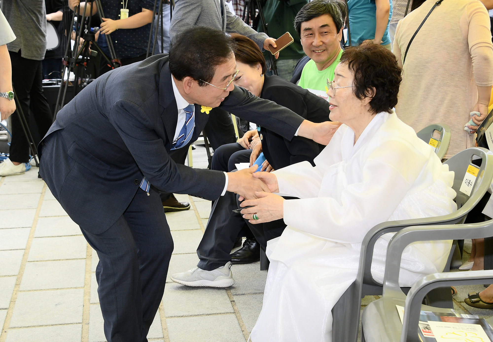 14일 오후 서울 중구 남산회현자락 옛 조선신궁터 부근에서 열린 3·1운동 100주년 기념 일본군 '위안부' 피해자 기림의 날 기념행사에서 박원순 서울시장, 위안부 피해자 이용수 할머니 등 참석자들이 기림비 동상과 기념촬영하고 있다. 서울시 제공
