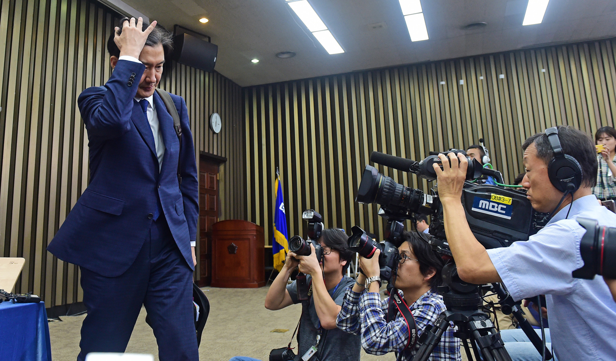 조국 법무부 장관 후보자가 2일 국회에서 열린 기자간담회에서 잠시 휴식을 갖기 위해 나서고 있다. 2019.9.2 사진/ 이종현기자(현장풀)