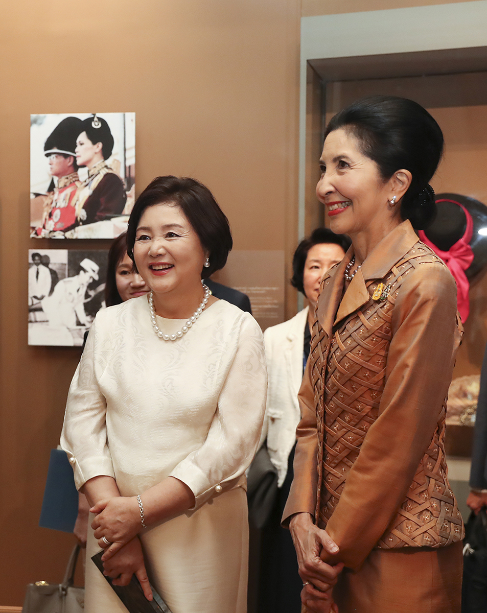 문재인 대통령의 부인 김정숙 여사가 2일 태국 방콕 퀸 시리킷 섬유박물관에서 쁘라윳 짠오차 태국 총리 부인 나라펀 여사와 함께 전시를 관람하고 있다.