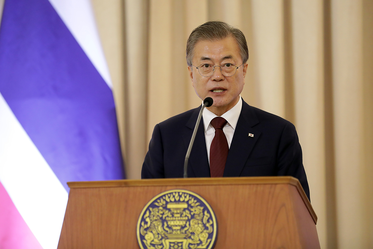 문재인 대통령이 태국 쁘라윳 짠오차 총리와 2일 방콕 총리실 청사에서 정상회담 및 각 부처 MOU 체결 후 공동언론발표를 하고 있다.