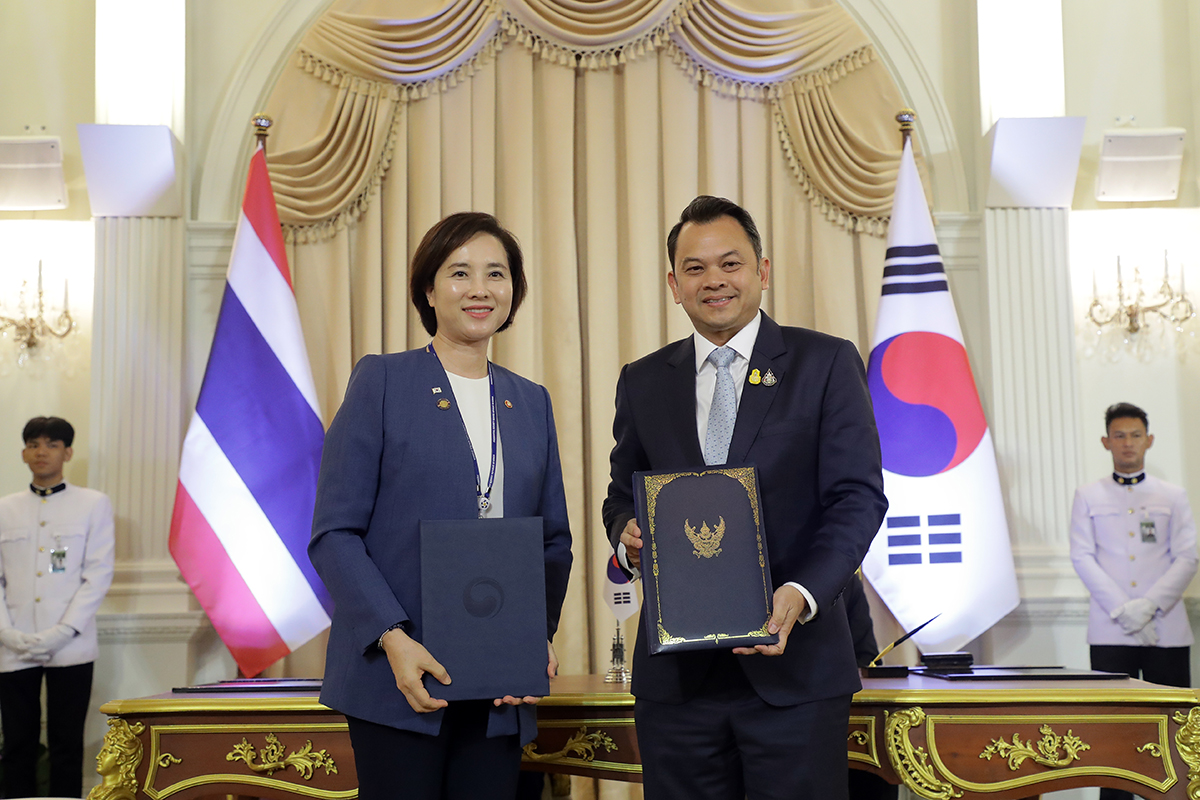 문재인 대통령과 쁘라윳 짠오차 총리가 2일 방콕 총리실 청사에서 열린 양해각서 서명식을 하고 있다.