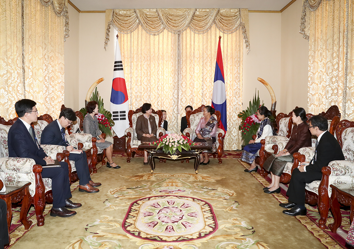 문재인 대통령의 부인 김정숙 여사가 5일(현지시간) 라오스 대통령궁에서 캄믕 라오스 대통령 영부인과 환담하고 있다. 2019.09.05