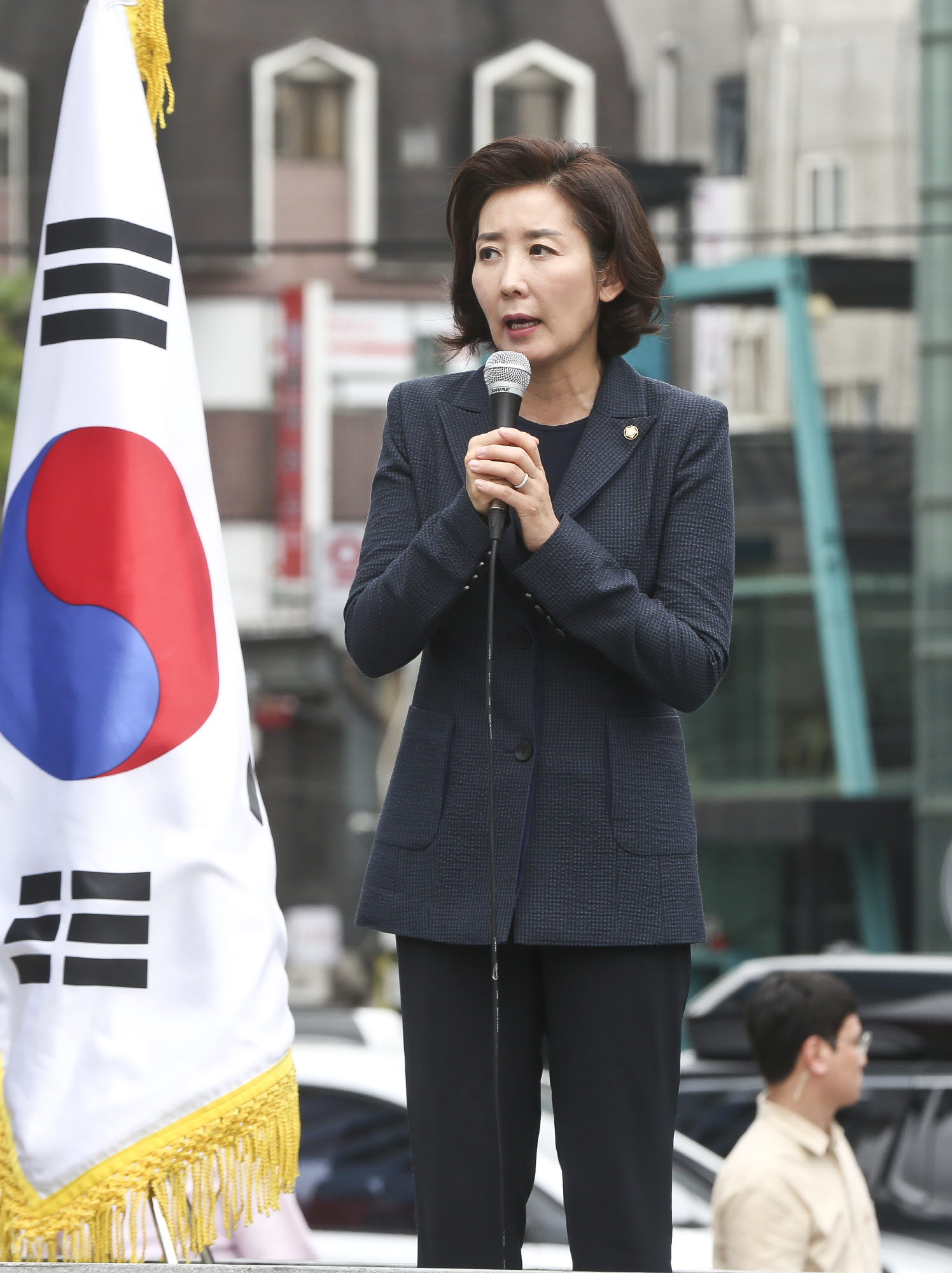 [서울=eoimage] 고성준 기자 = 나경원 자유한국당 원내대표가 10일 서울 현대유플렉스 신촌점 앞에서 열린 '살리자 대한민국 ! 문재인정권 규탄대회'에 참석해 발언하고 있다. 2019.9.10