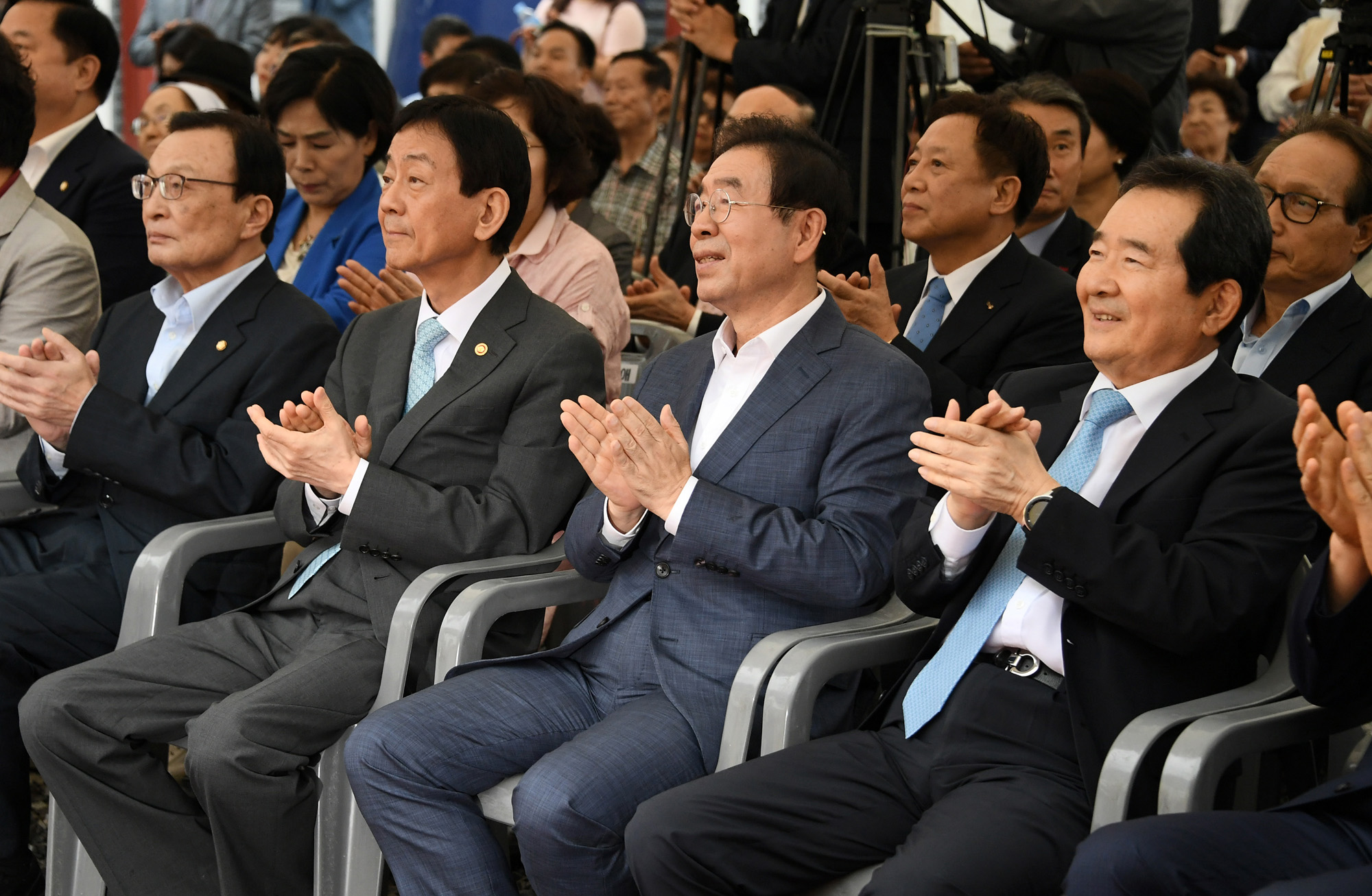 | 사진설명 | 4일 오후 서울 종로구 원서동 노무현시민센터 건립부지에서 열린 기공식에서 주요 내빈들이 시삽을 하고 있다. 왼쪽 세 번째부터 박원순 서울시장, 한명숙 전 총리, 진영 행정안전부 장관, 유시민 노무현재단 이사장, 이해찬 더불어민주당 대표, 정세균 전 국회의장, 김영종 종로구청장, 강기정 청와대 정무수석, 이기명 노무현재단 고문, 천호선 노무현시민센터건립추진단장, 김현 전 의원. 서울시 제공 |