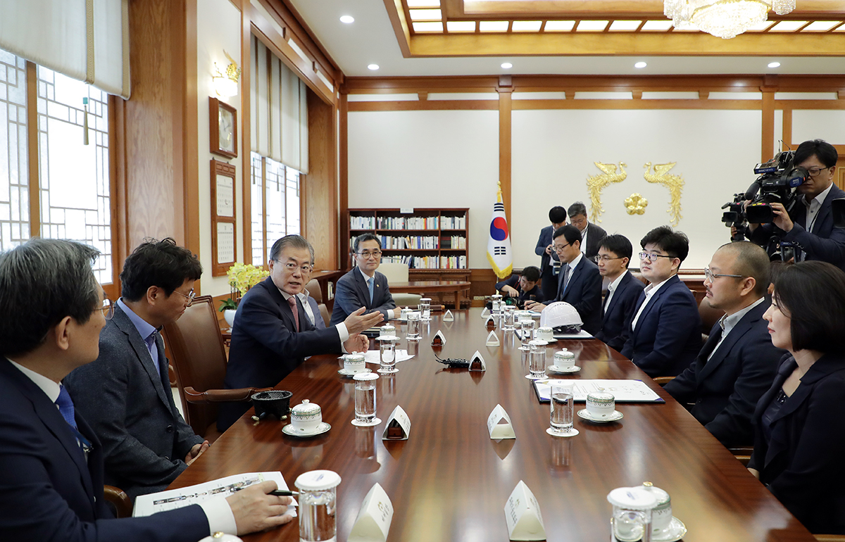 문재인 대통령이 19일 청와대 본관 집무실에서 열린 200만호 특허증 및 100만호 디자인등록증 수여식을 마친 후 참석자들과 환담하고 있다