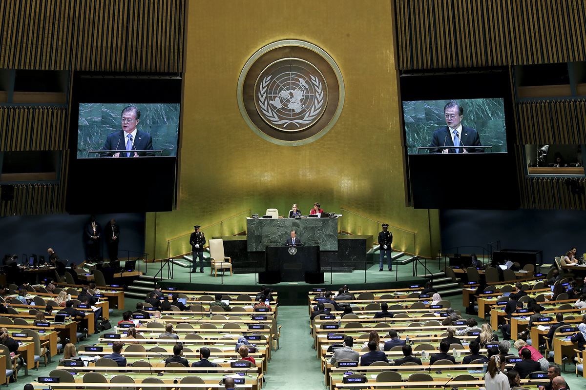 문재인 대통령이 24일 오후(현지시간) 미국 뉴욕 유엔 총회장에서 기조연설을 하고 있다. 이 자리에서 문 대통령은 "나는 오늘 유엔의 가치와 전적으로 부합하는 이 세 가지 원칙을 바탕으로 유엔과 모든 회원국들에게 한반도의 허리를 가로지르는 비무장지대를 국제평화지대로 만들자는 제안을 하고자 한다"고 밝혔다. 2019.09.23 사진 청와대제공 |