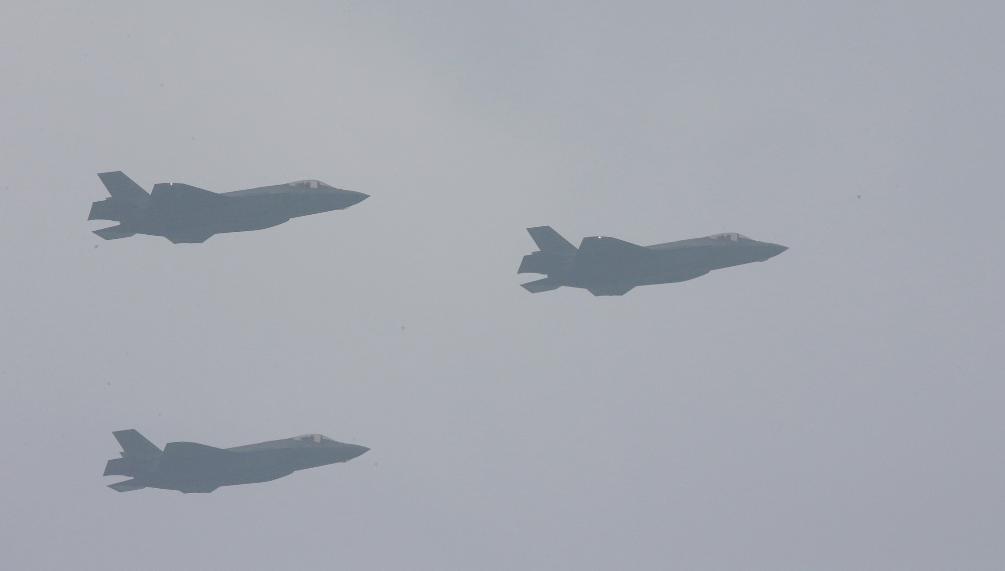 문재인 대통령이 1일 대구 공군기지에서 열린 국군의 날 행사 중 F-35A 스텔스 전투기 3대가 행사장 상공을 날고 있다. 2019.10.01 사진 공동취재단