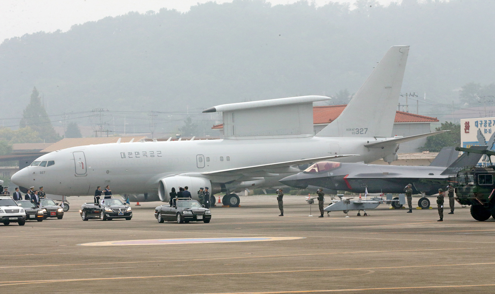 | 사진설명 | 문재인 대통령이 1일 대구 공군기지에서 열린 국군의 날 행사 중 지상사열을 하며 E-737 피스아이 공중조기경보통제기, F-35A 스텔스 전투기 앞을 지나고 있다. 이번 지상사열은 육·해·공군 전력 총 4 제대로 공중·대공방호·미사일 타격·대화력전 타격 자산 순으로 구성됐다. 2019.10.01 사진 공동취재단 |