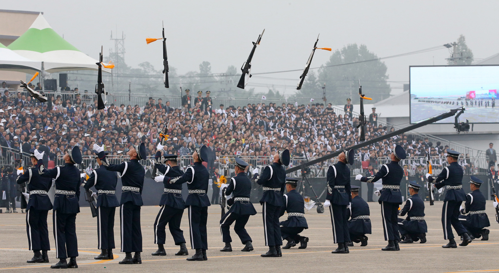 1일 대구 공군기지에서 열린 국군의 날 행사에서 의장대가 멋진 시범을 보이고 있다. 2019.10.01 사진 공동취재단