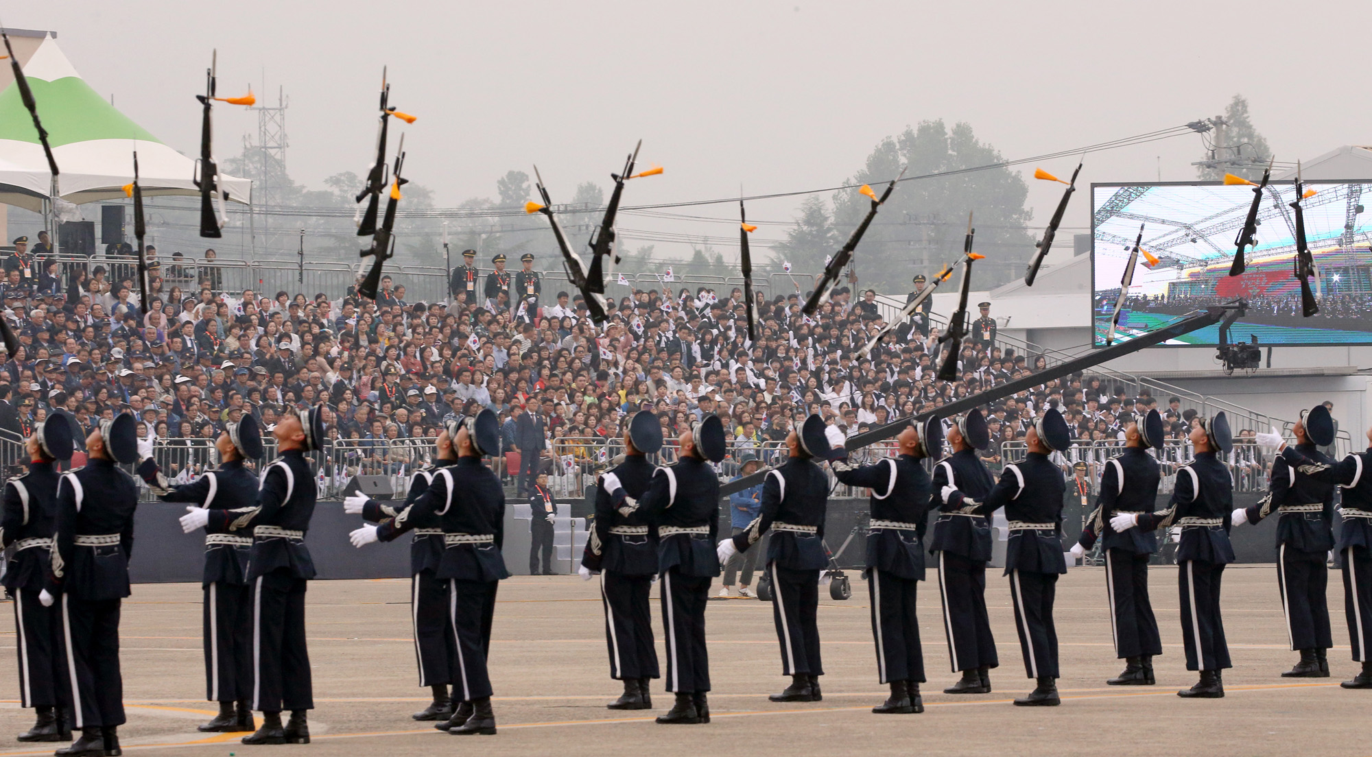 1일 대구 공군기지에서 열린 국군의 날 행사에서 의장대가 멋진 시범을 보이고 있다 2019.10.01 사진 공동취재단