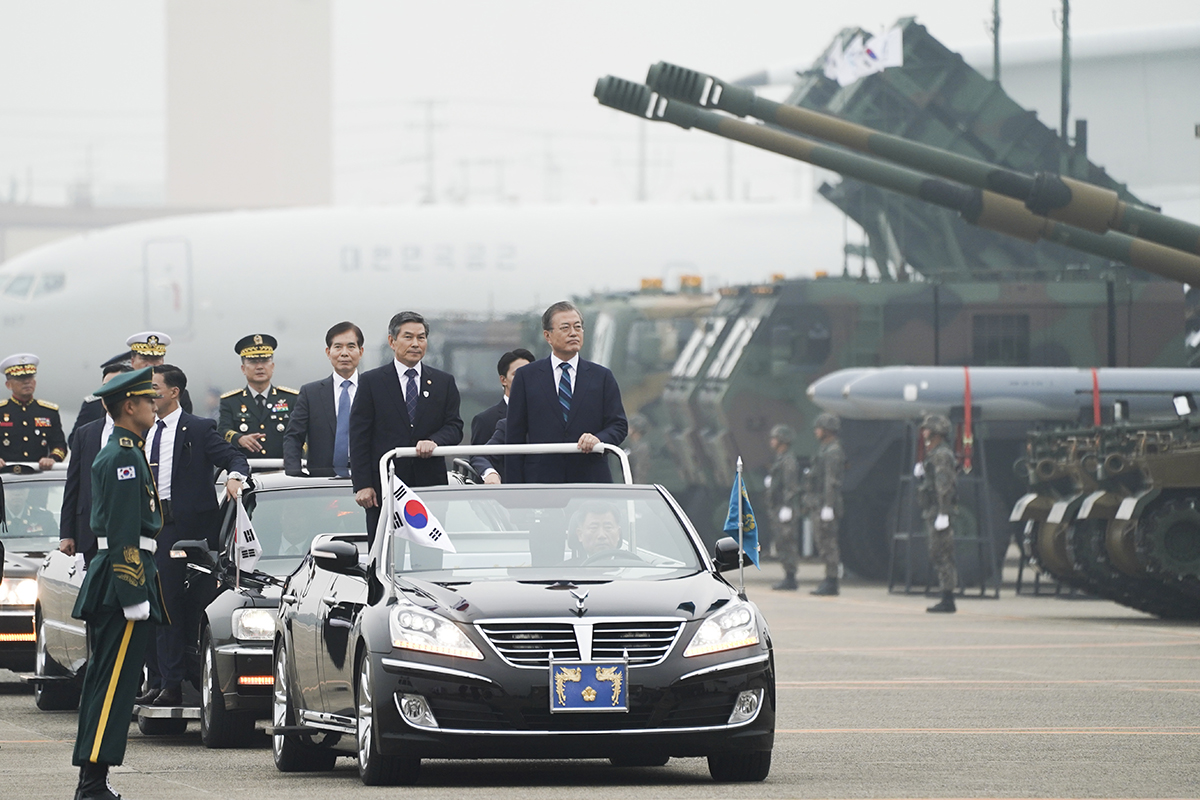 문재인 대통령이 1일 오전 대구 공군기지(제11전투비행단)에서 열린 '제71주년 국군의 날 행사'에서 육,해,공군 전력 지상사열을 받고 있다.