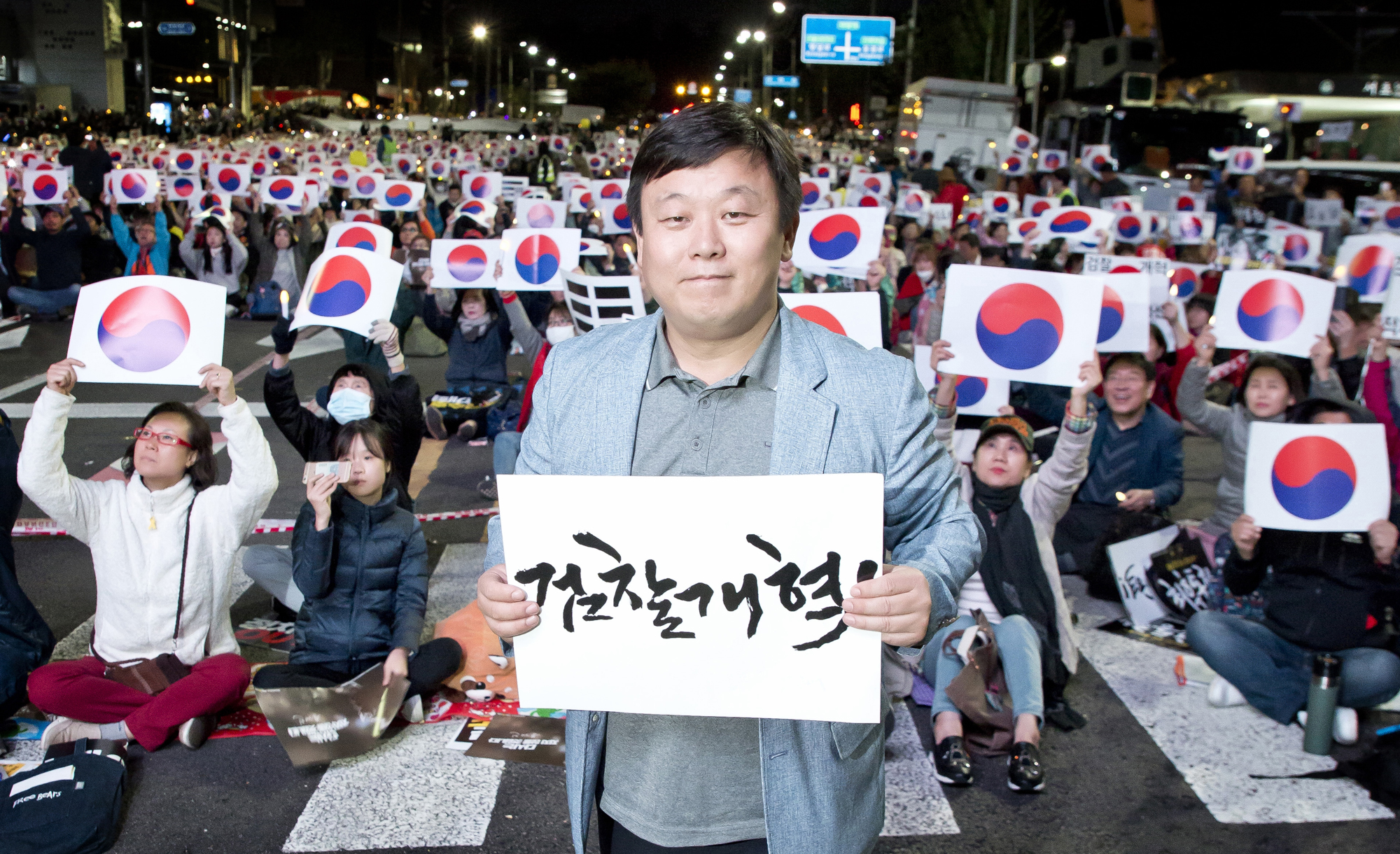 [eoimage=서울] 임준선 기자 =12일 오후 검찰개혁 사법적폐청산 범국민시민연대가 주최한 제 9차 검찰개혁 촛불문화제 에서 민생경제 연구소 안진걸 소장이 피켓을 들고 사진포즈를 취하고 있다. 2019.10.12 eomaster@eoimage.com