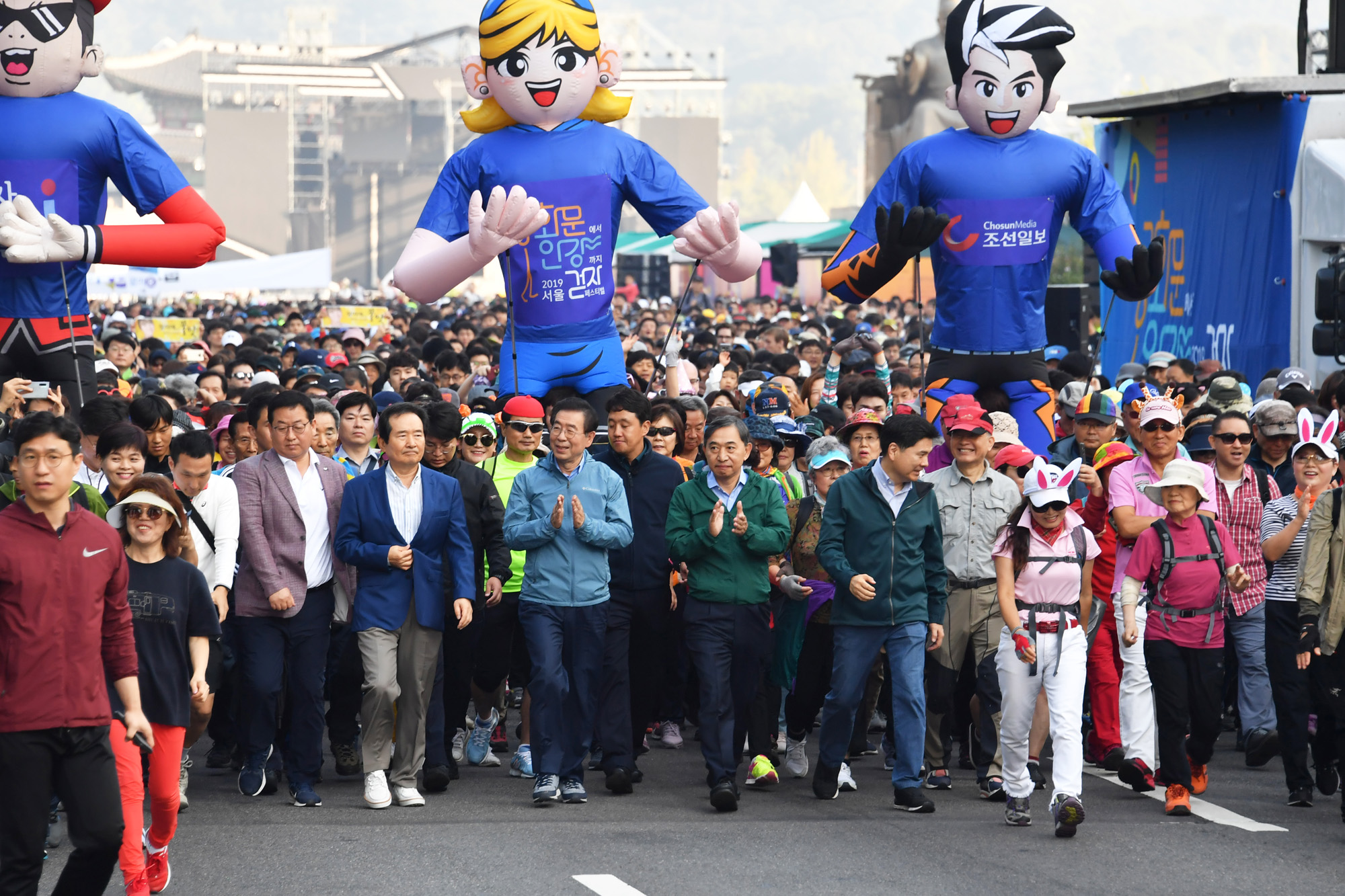 박원순 서울시장이 29일 서울 광화문광장에서 열린 '2019 서울 걷·자 페스티벌'에서 내빈들과 함께 이동하고 있다. 서울시 제공