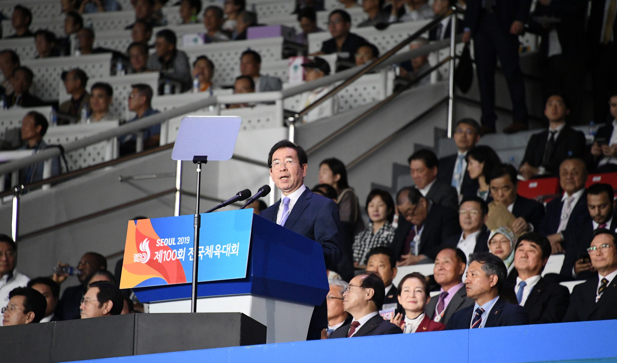 박원순 시장이 4일 오후 6시 30분 서울 잠실종합운동장 올림픽 주경기장에서 열린 제 100회 전국체육대회 개회식에 참석하고 있다. 서울시 제공