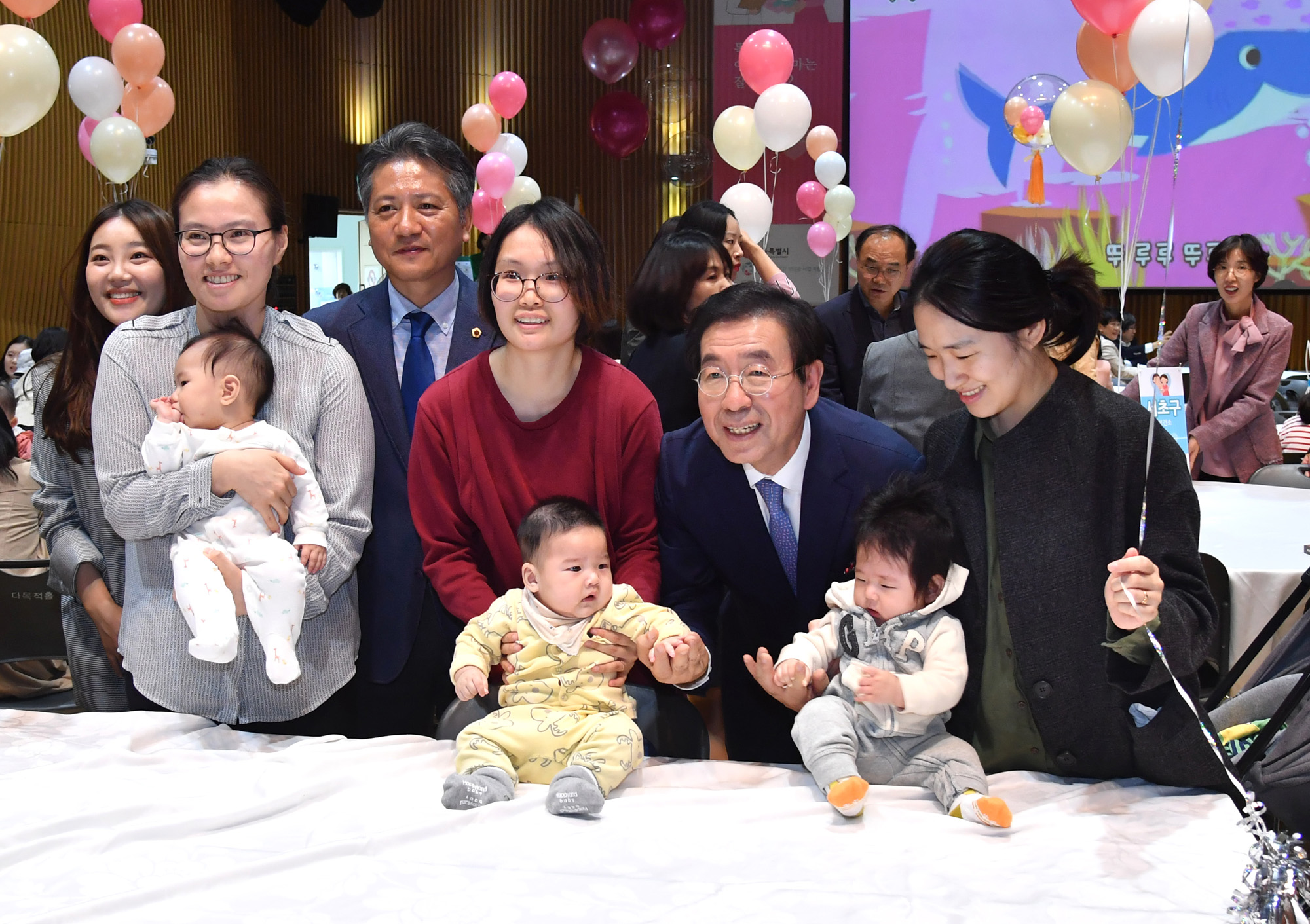 박원순 서울시장이 10일 서울 중구 서울시청에서 열린 '서울아기 건강 첫걸음 나눔터'에서 한 아이를 안고 행사에 참석하고 있다. 서울시 제공