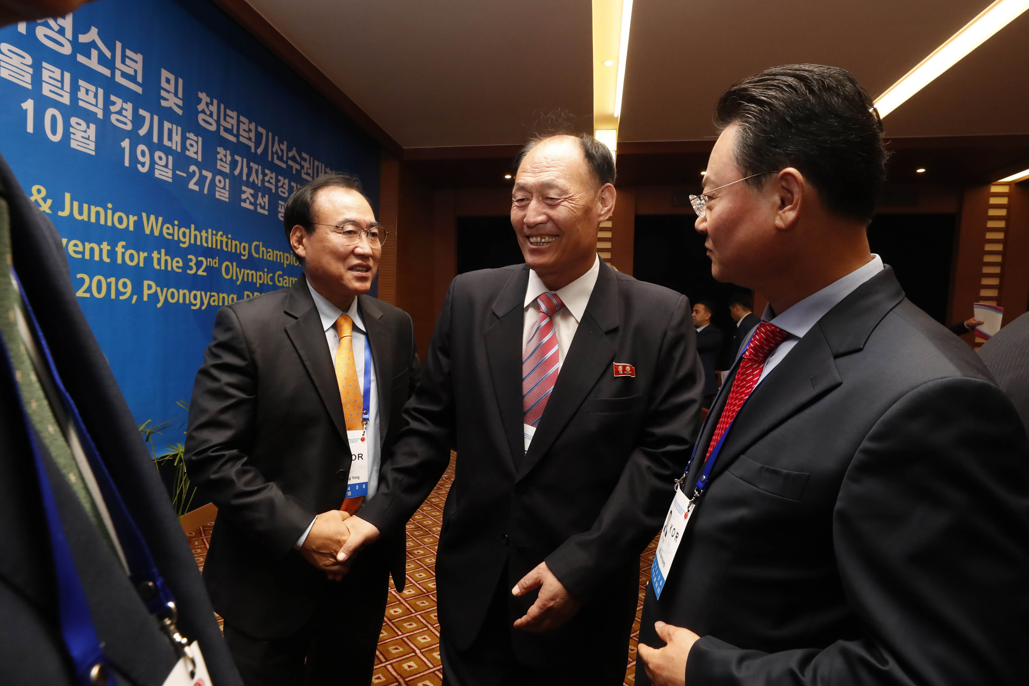 2019 아시아역도연맹 총회가 열린 20일 오전 평양 서산호텔에서 최성용 대한역도연맹 회장(왼쪽)이 김광덕 조선력기협회 서기관(가운데)을 만나 인사하고 있다.2019.10.20 평양/사진공동취재단