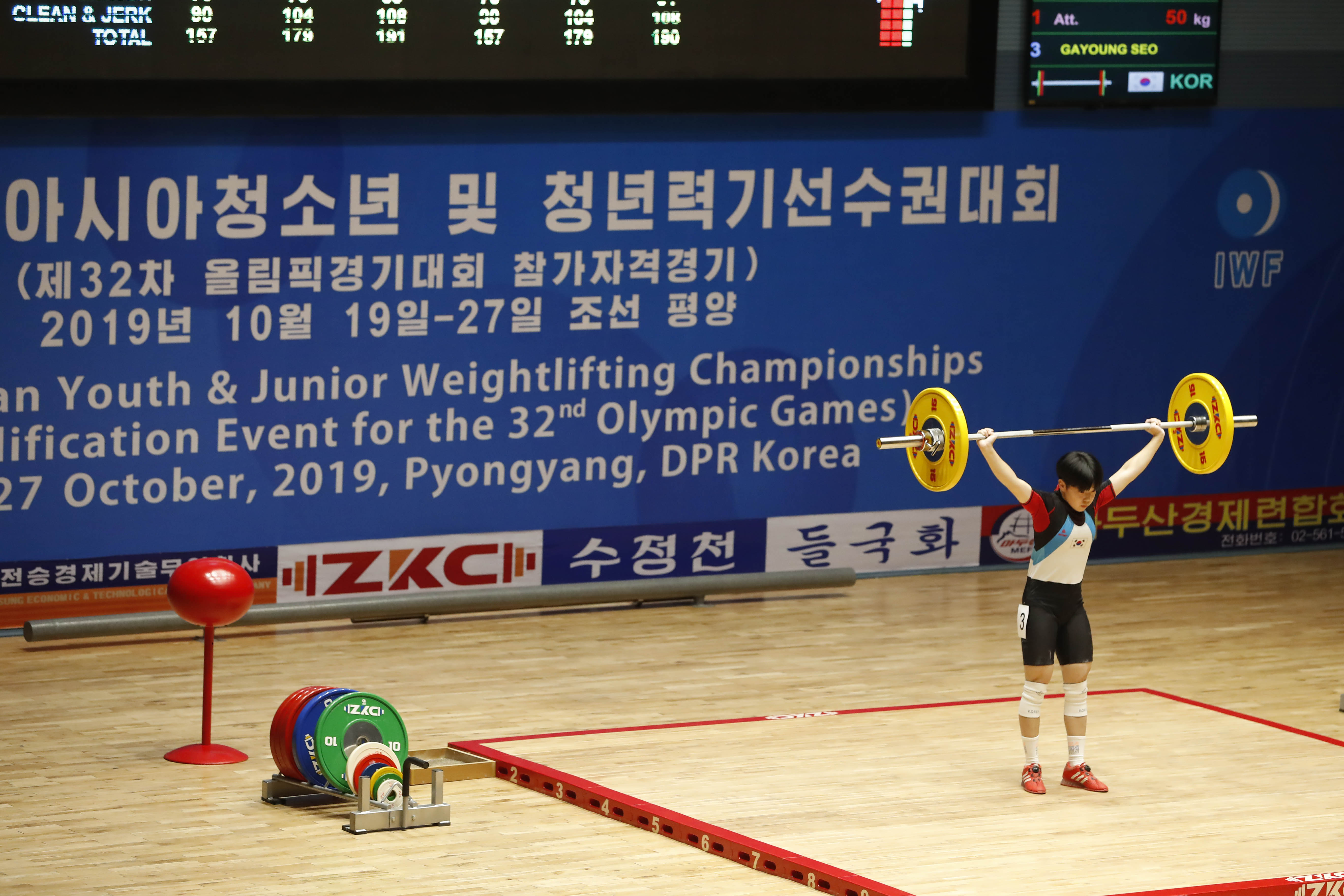 | 사진설명 | 2019 아시아 유소년·주니어 역도선수권대회가 열리고 있는 21일 오전 평양 청춘가역도경기장에서 유소년 여자 45kg급에 출전한 서가영 선수(15·성환중)가 인상 1차시기 50kg 바벨을 들어올리고 있다. 이날 서 선수는 인상 54kg, 용상68kg 합계 122kg을 들어올렸다. 2019.10.21 평양/사진공동취재단 |