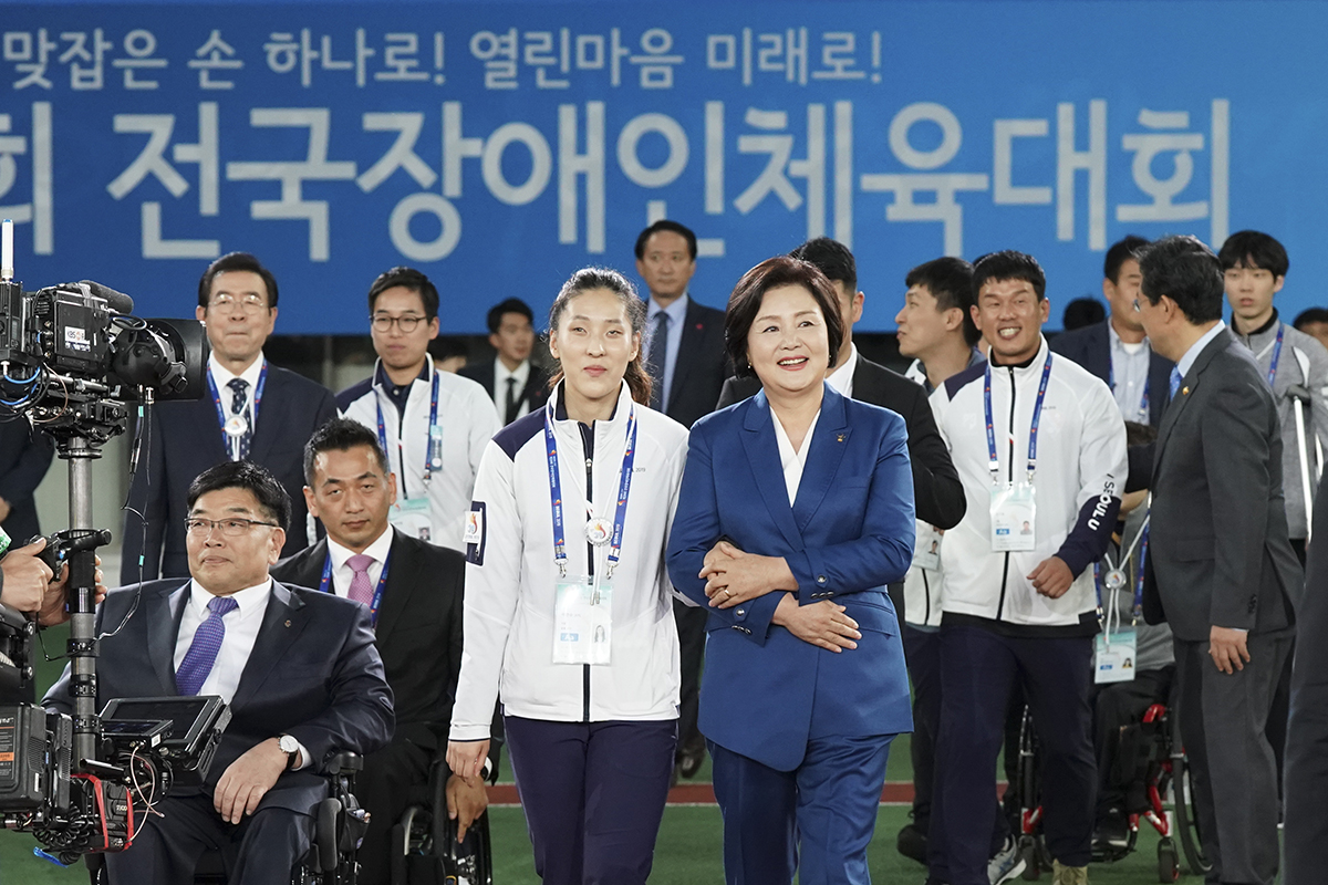 문재인 대통령의 부인 김정숙 여사가 15일 오후 서울 송파구 잠실종합운동장 주경기장에서 열린 '2019 서울 제39회 전국장애인체육대회' 개회식에 참석하고 있다.