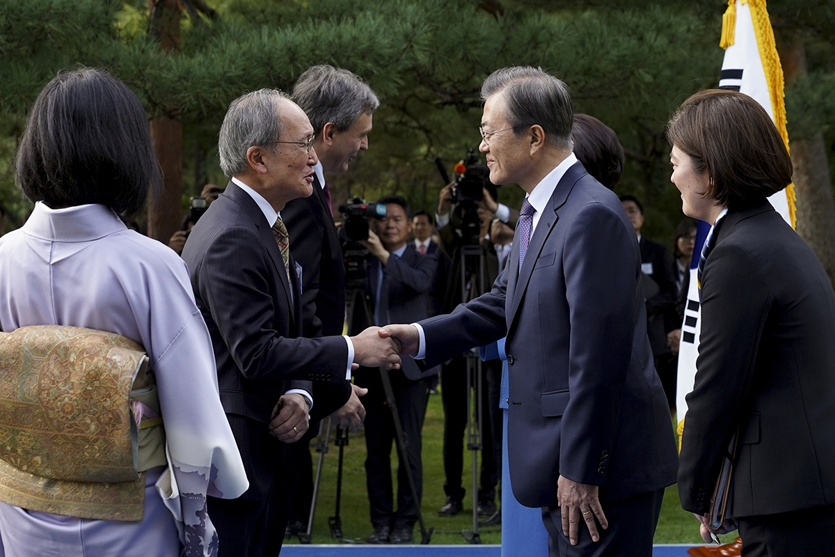 문재인 대통령이 18일 오후 청와대 녹지원에서 열린 주한외교단 초청 리셉션에서 나가미네 야스마사 주한일본대사(왼쪽)와 인사하고 있다.