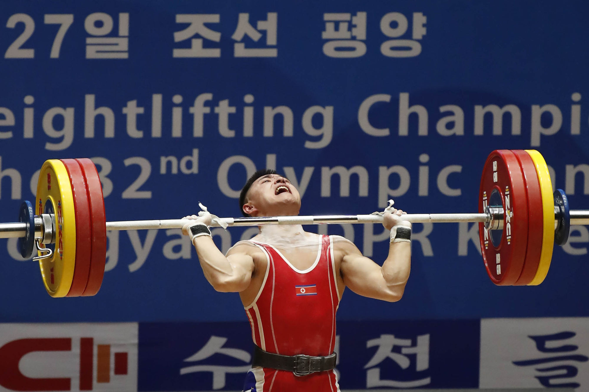 2019 아시아 유소년·주니어 역도선수권대회가 열리고 있는 22일 평양 청춘가역도경기장에서 유소년 남자 61kg급에 출전한 북측의 김충국 선수가 용상 2차시기 159kg 바벨을 들어올리고 있다. 2019.10.22 평양/사진공동취재단