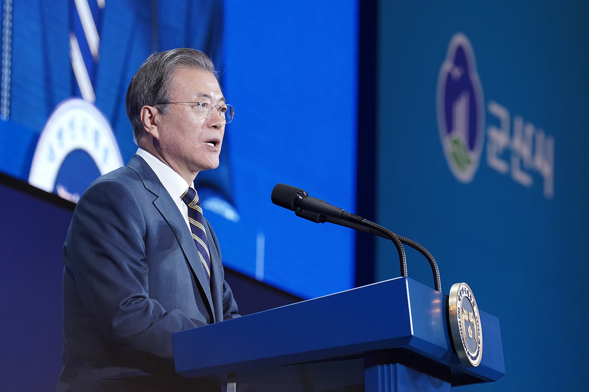 문재인 대통령이 24일 전북 군산시 명신 군산공장에서 열린 전북 군산형 일자리 상생협약식에서 인사말을 하고 있다. 2019.10.24 사진 청와대제공