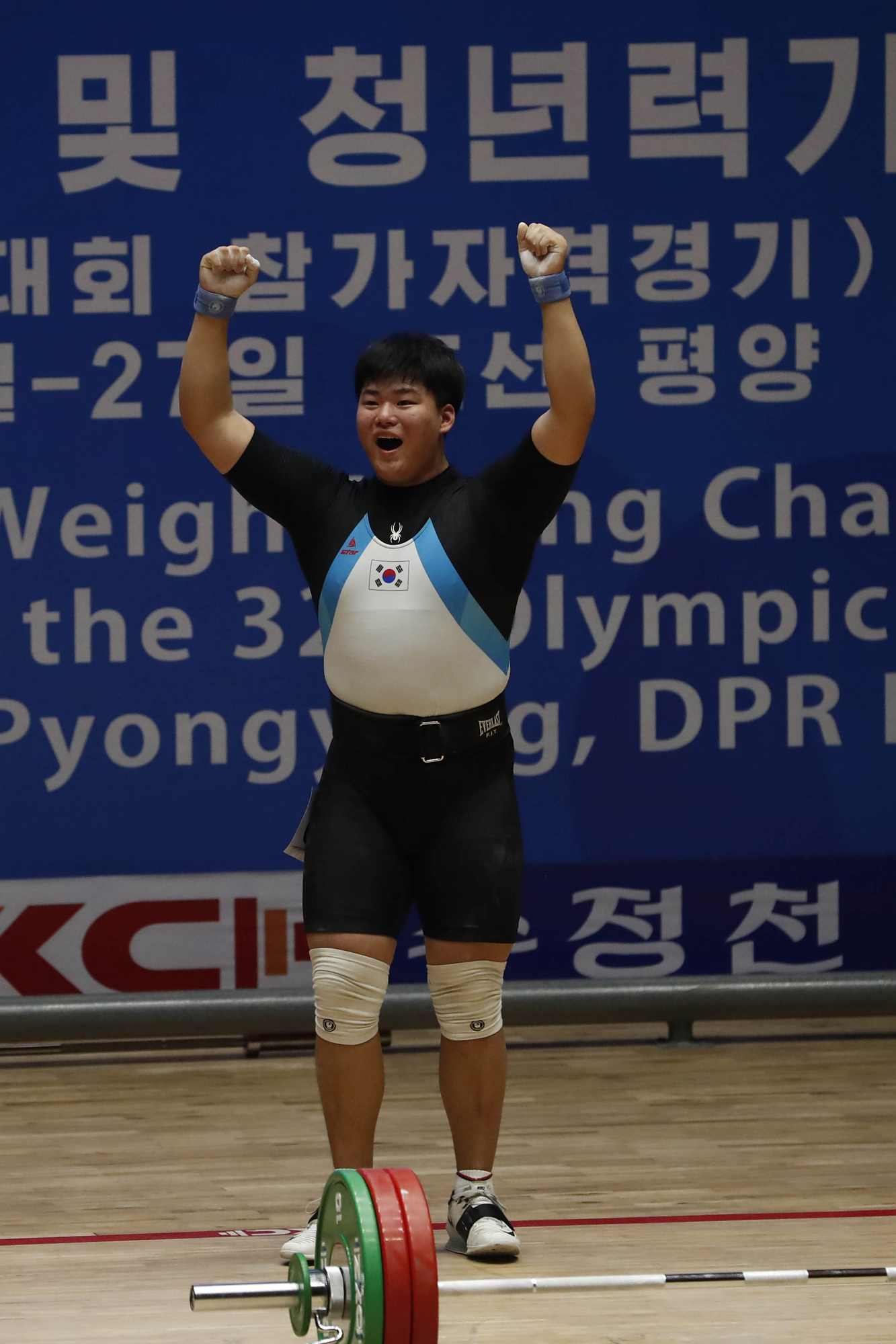 2019 아시아 유소년·주니어 역도선수권 대회가 열리고 있는 평양 청춘가역도전용경기장에서 27일 오후 유소년 남자 +102㎏급에 출전한 이승훈(서울체고)이 인상 3차 147kg을 들어올린 뒤 기뻐하고 있다. 2019.10.27 평양/사진공동취재단