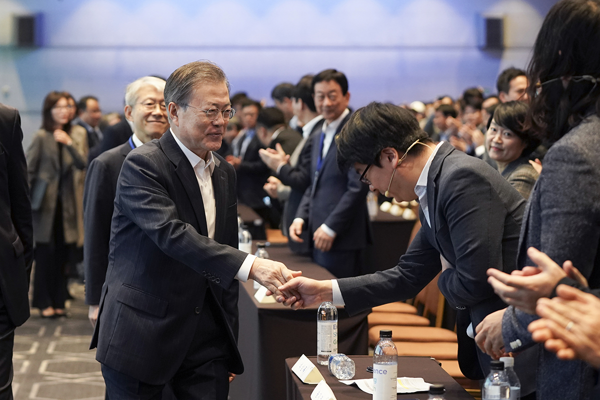 문재인 대통령이 28일 오전 서울 강남구 삼성동 코엑스에서 열린 소프트웨어·인공지능(AI) 분야 콘퍼런스인 ‘데뷰(DEVIEW) 2019’에 참석하고 있다.