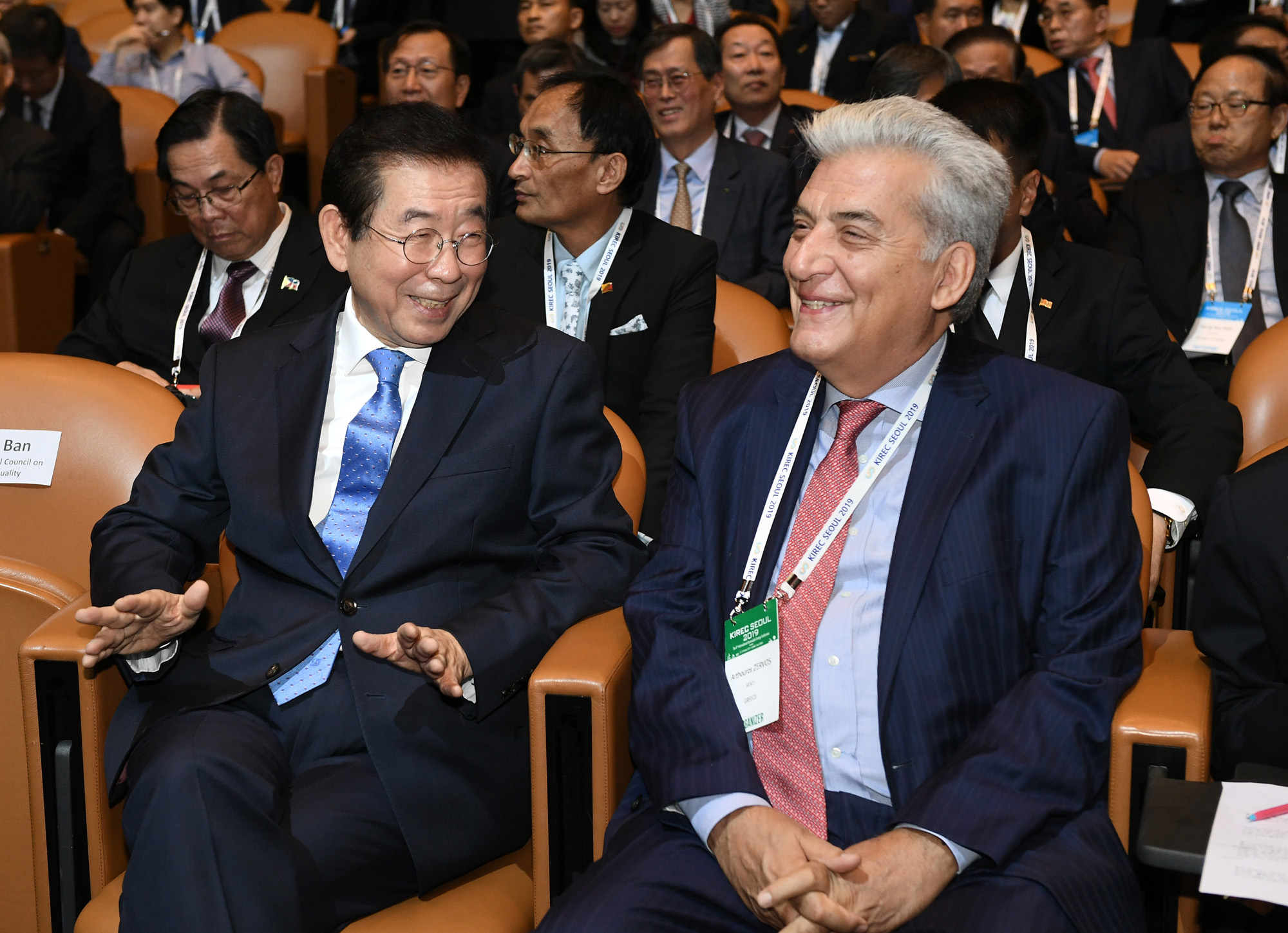 박원순 서울시장이 23일 오전 서울 강남구 코엑스에서 열린 제8회 세계재생에너지총회(KIREC)에 참석해 환영사를 하고 있다. 서울시 제공