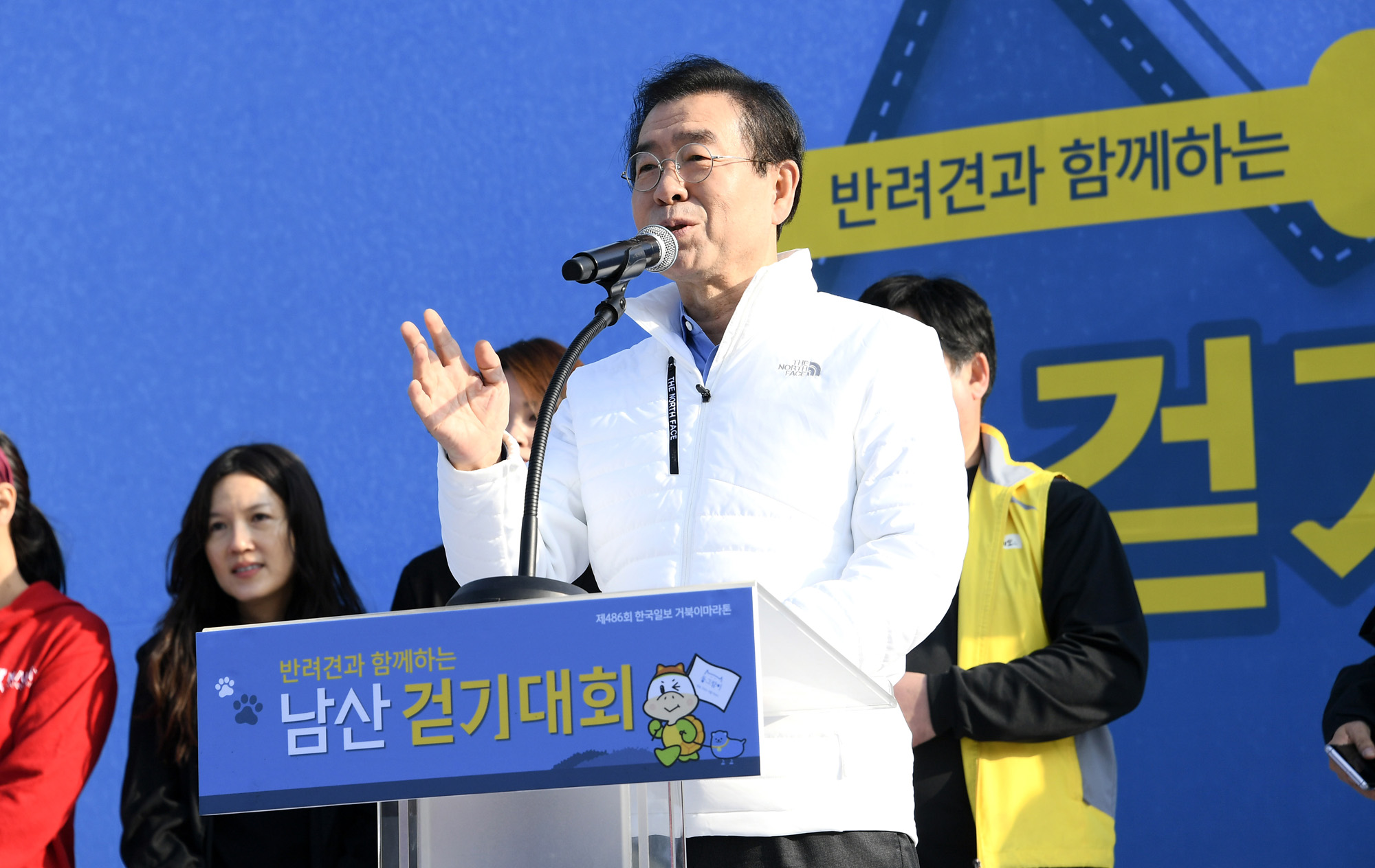박원순 서울시장이 26일 오전 서울 중구 남산 백범광장에서 열린 '반려견과 함께하는 남산 걷기대회'에서 반려견과 걷고 있다. 서울시 제공