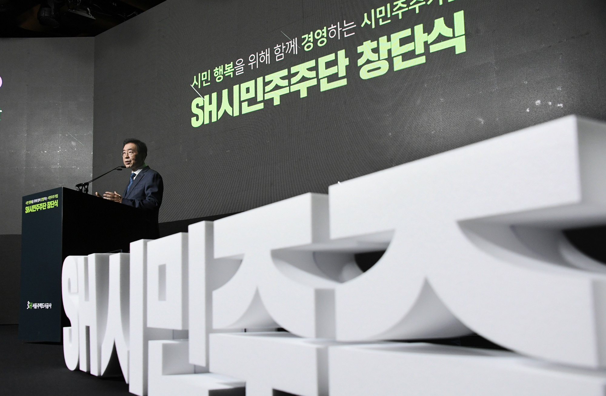 SH 시민주주단 창단식이 열린 28일 오후 서울 중구 더 플라자호텔 그랜드볼룸에서 박원순 서울시장, 전현희 더불어민주당 의원, 김세용 SH공사 사장 등 참석자들이 창단 퍼포먼스를 하고 있다. 서울시 제공