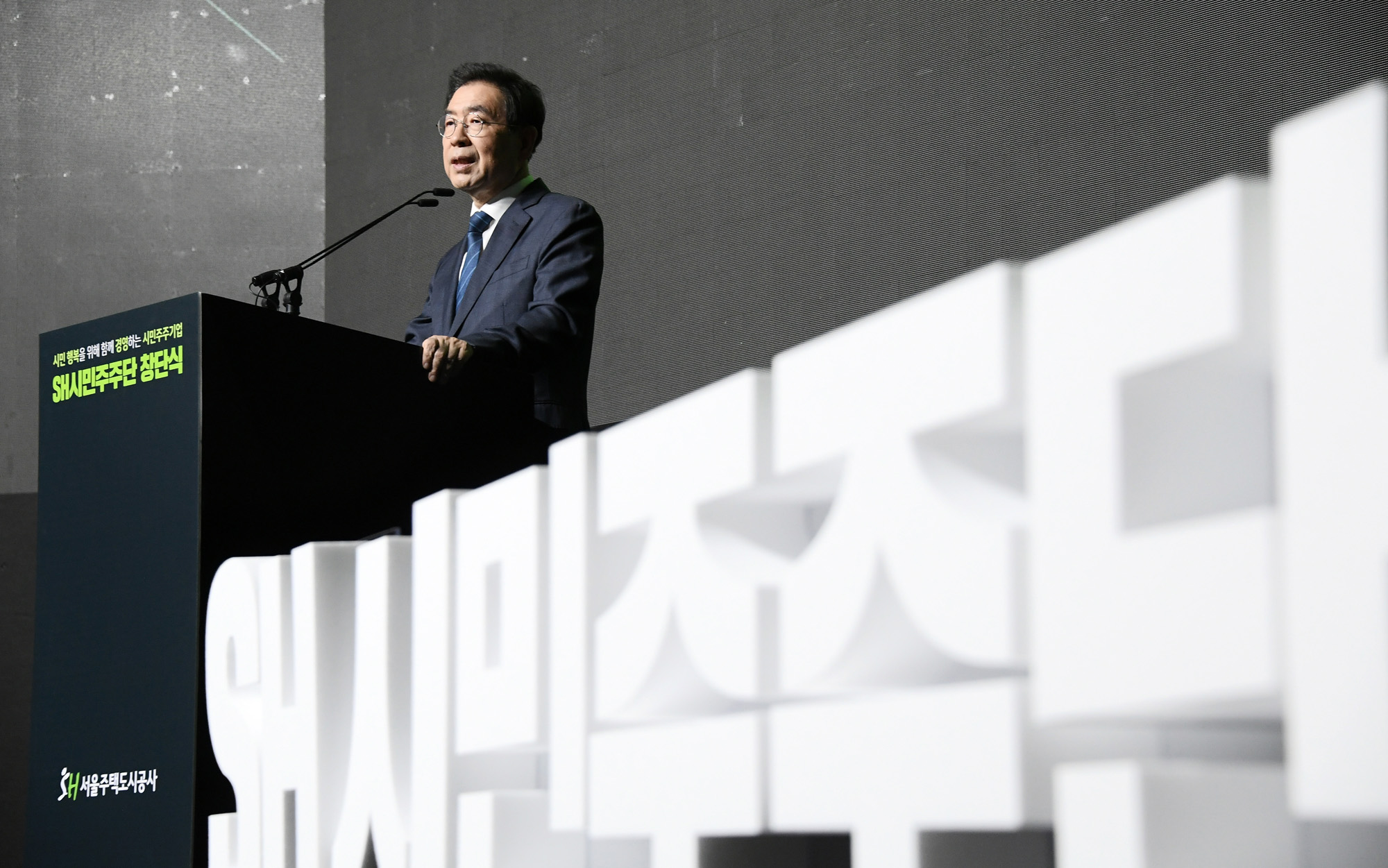 SH 시민주주단 창단식이 열린 28일 오후 서울 중구 더 플라자호텔 그랜드볼룸에서 박원순 서울시장, 전현희 더불어민주당 의원, 김세용 SH공사 사장 등 참석자들이 창단 퍼포먼스를 하고 있다. 서울시 제공